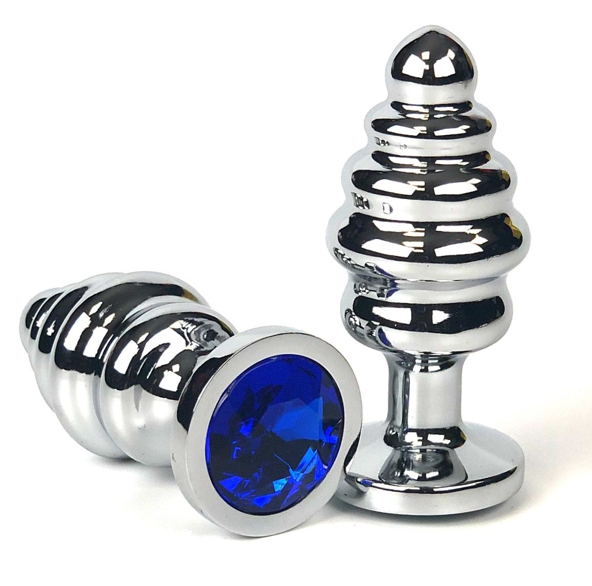 Серебристая ребристая анальная пробка с синим кристаллом