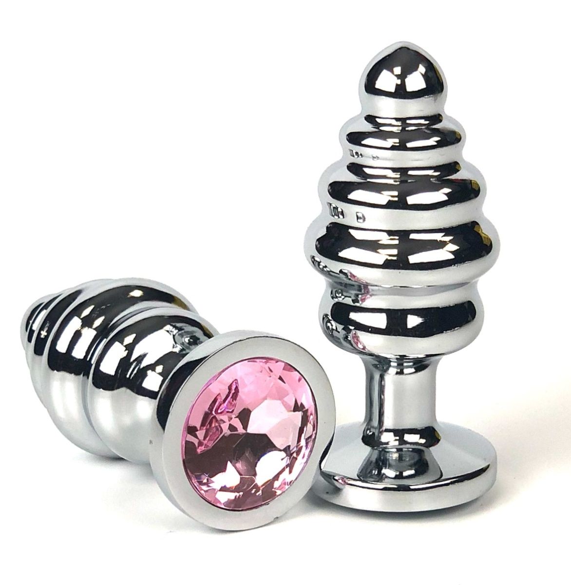 Серебристая ребристая анальная пробка с нежно-розовым кристаллом