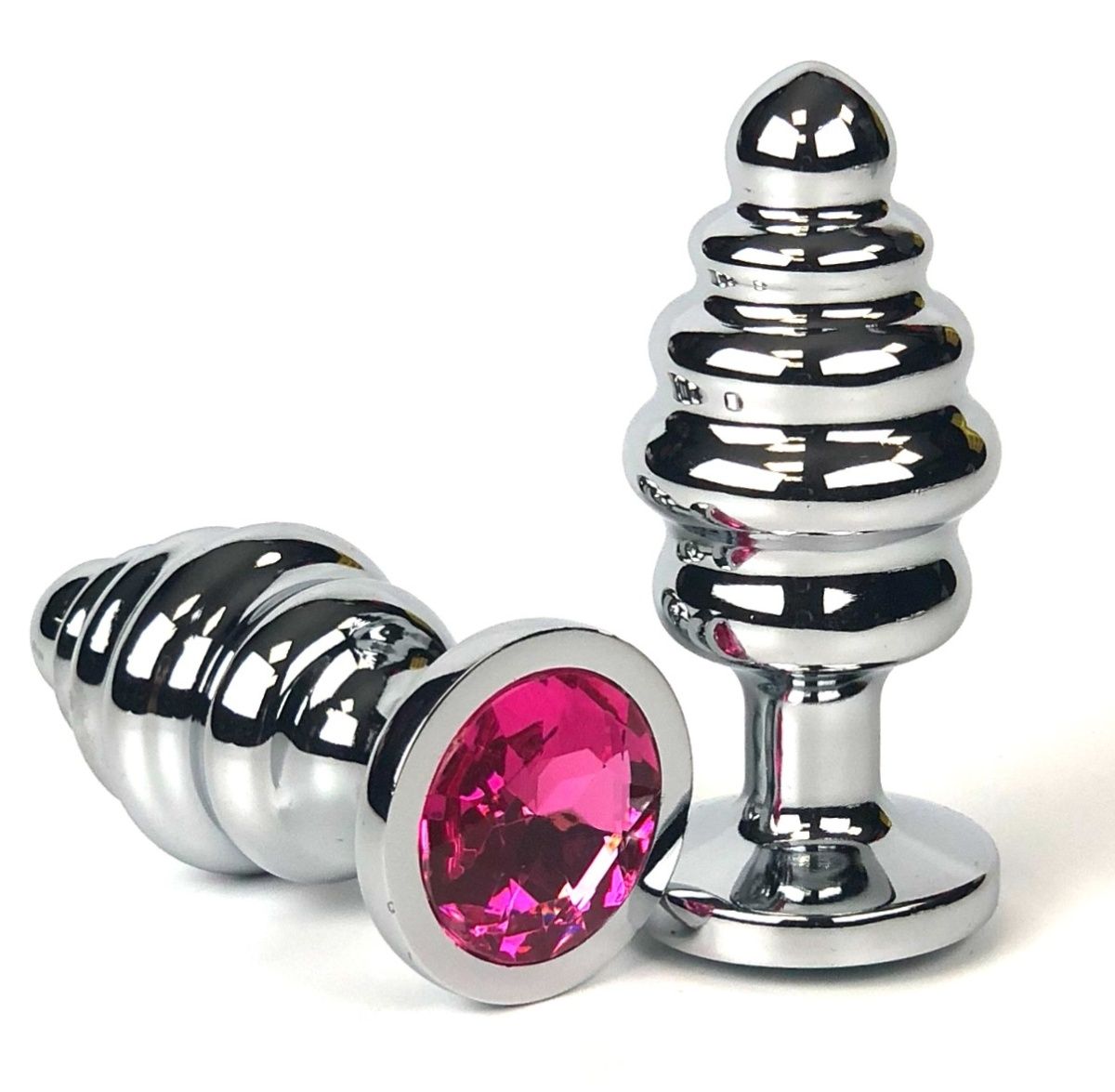 Серебристая ребристая анальная пробка с розовым стразом