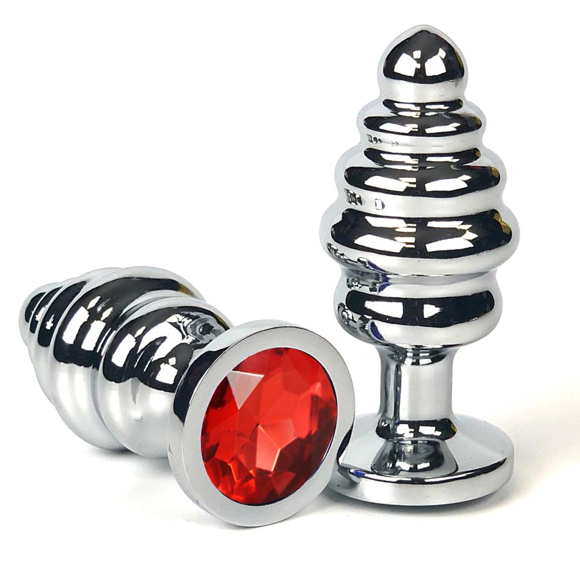 Серебристая ребристая анальная пробка с красным кристаллом Vandersex 185-RRS (6 см)
