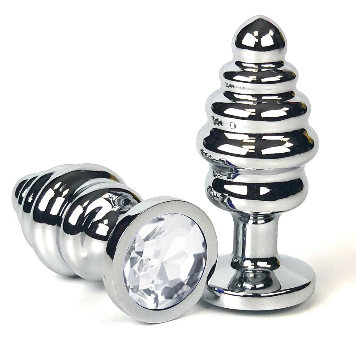 Серебристая ребристая анальная пробка с прозрачным кристаллом