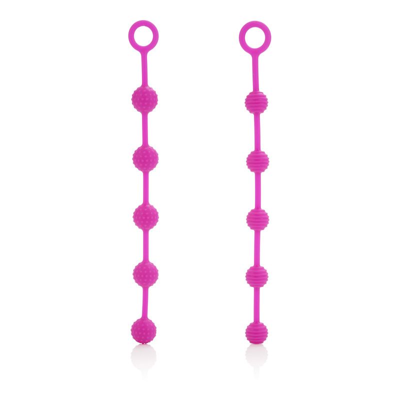С этим розовым набором вы и ваша попка получите столько удовольствия! Шарики одной цепочки покрыты шишечками, а второй – рёбрышками. Выбирайте рельеф, а после – вводите любую из цепочек в анус. Погружение каждого шарика отзовётся разливающимся по телу блаженством. Если же потянуть за ручку-кольцо, вся цепочка окажется снаружи, а вы – в состоянии ярчайшего оргазма! Длина цепочки с шишечками - 25,5 см., диаметр - 2,5 см. Длина цепочки с рёбрышками - 22,75 см., диаметр - 2 см.