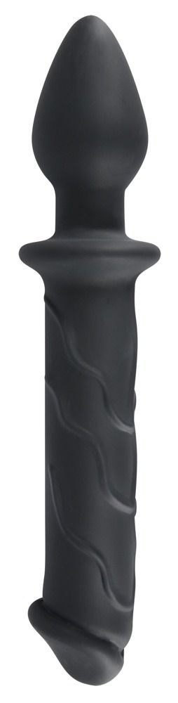 Черный двусторонний стимулятор Dildo Plug. Представляет собой рельефный фаллос с одной стороны и гладкую пробку с другой. Длина фаллоса - 14,5 см., диаметр - 3,7 см. Длина пробки - 7,5 см., диаметр - 4 см.