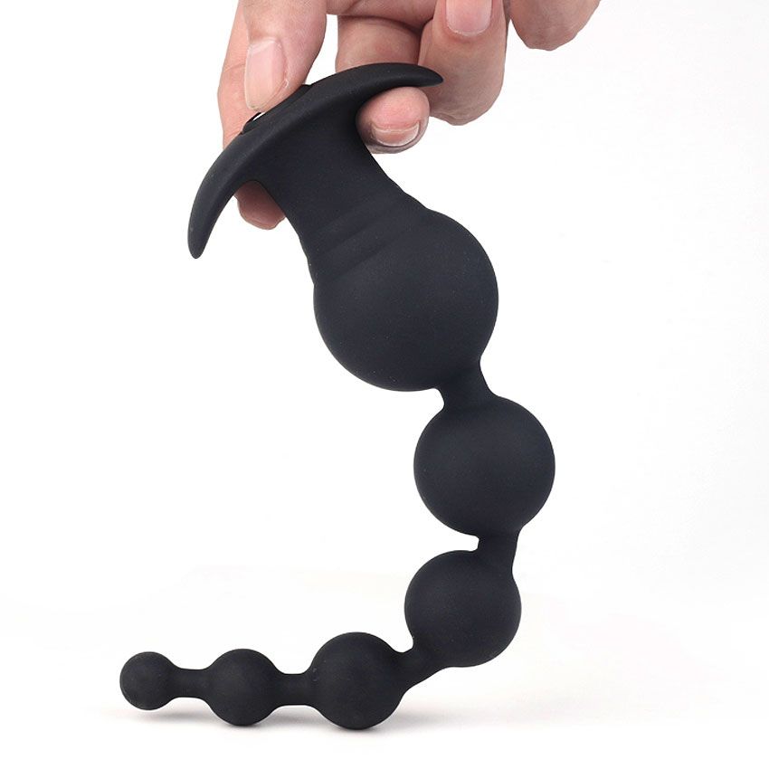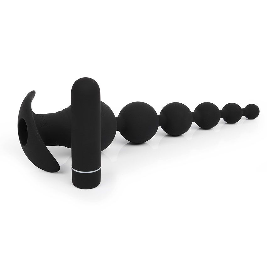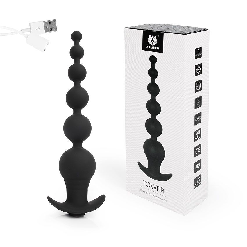 Черная анальная виброелочка TOWER. Выполнена из силикона, состоит из 6 шариков, имеет 9 режимов вибрации. Минимальный диаметр - 1,3 см.