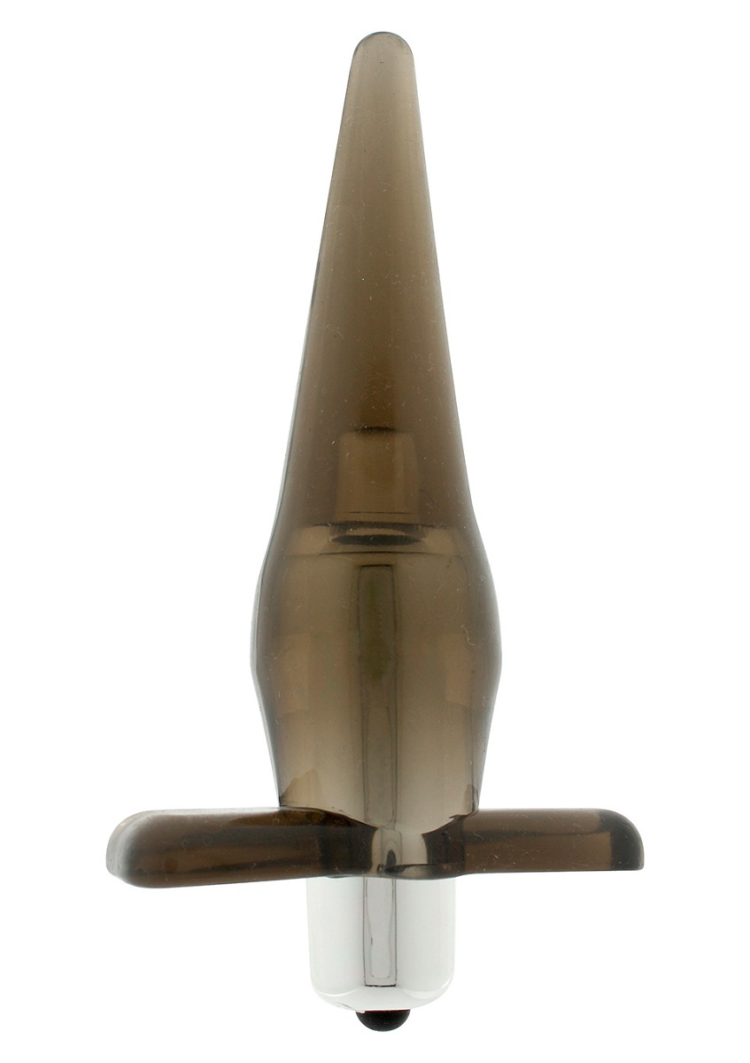 Полупрозрачная небольшая анальная пробка с одной скоростью вибрации серого цвета. Имеет ограничитель для безопасного применения. Очень гибкая, без резкого запаха. Водонепроницаемая. Работает от батареек «таблеток», продаются вместе с игрушкой.