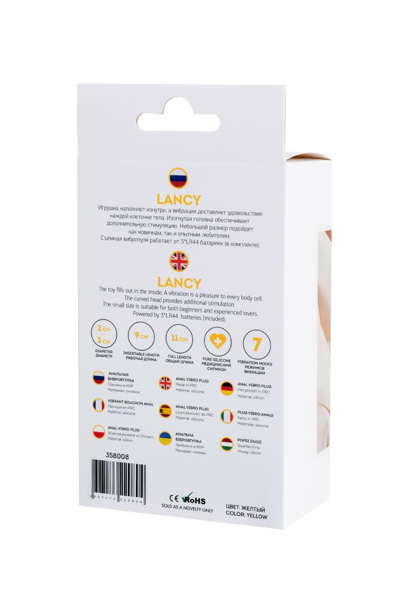 Анальная вибровтулка Lancy. Игрушка наполняет изнутри, а вибрация доставляет удовольствие каждой клеточке тела. Изогнутая головка обеспечивает дополнительную стимуляцию. Небольшой размер подойдёт как новичкам, так и опытным любителям. Рабочая длина - 9 см. Минимальный диаметр - 2 см.