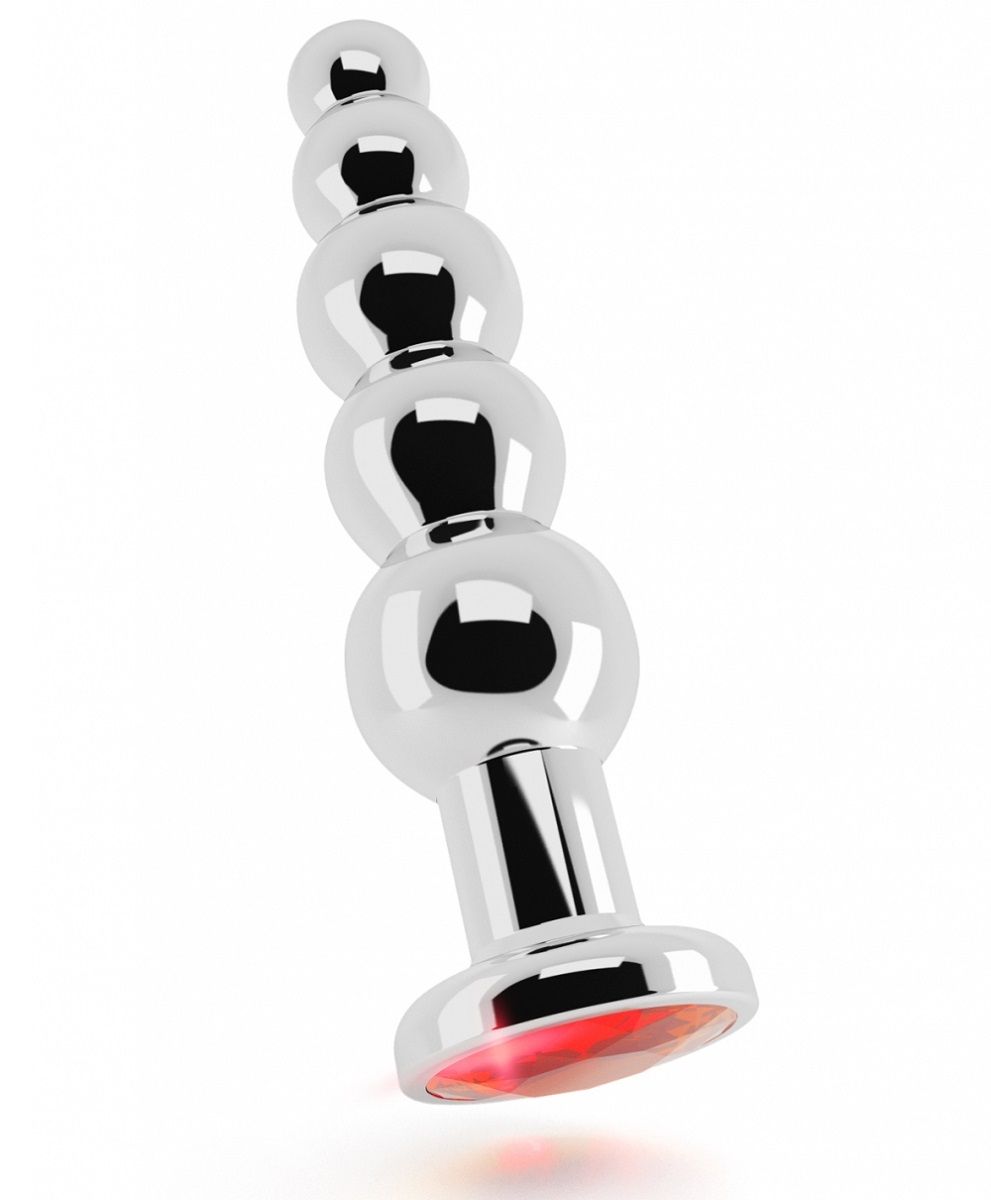 Роскошная анальная металлическая пробка имеет элегантный дизайн, плавные изгибы и эргономичную форму в виде елочки. Имеет удобную форму для анальных игр - заостренную вверху и плавно расширяющуюся нижнюю часть с ограничительным основанием для безопасного использования. Игрушку можно нагревать или охлаждать для придания играм более красочных ощущений. Основание пробки украшает великолепный страз красного цвета. Рабочая длина - 12,5 см.