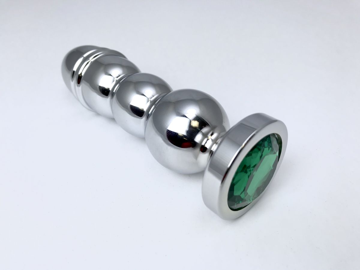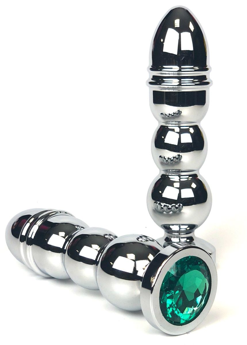 Серебристая закругленная анальная пробка-ёлочка с зелёным кристаллом Vandersex 159-MAT18 (13 см)