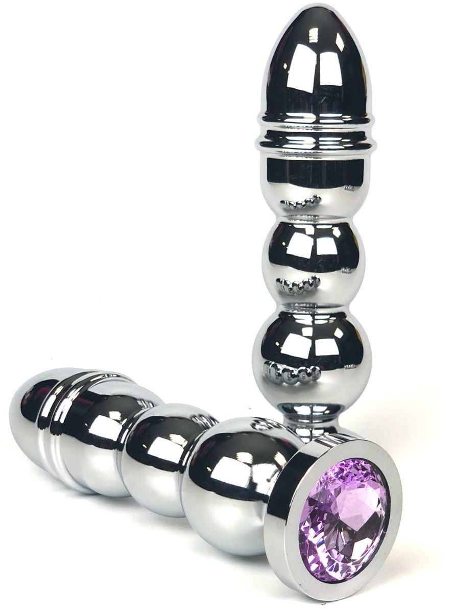 Серебристая закругленная анальная пробка-ёлочка с сиреневым кристаллом Vandersex 159-MAT5 (13 см)