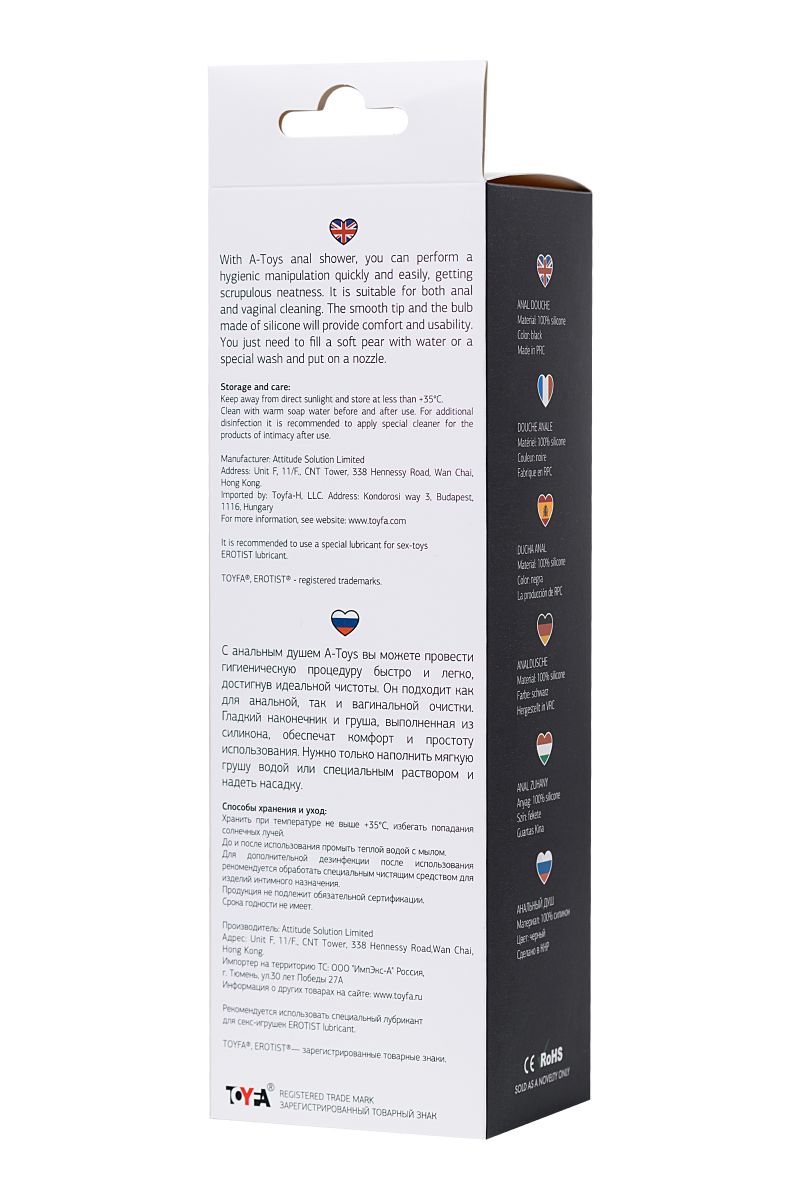 С анальным душем A-Toys вы можете провести гигиеническую процедуру быстро и легко, достигнув идеальной чистоты. Он подходит как для анальной, так и вагинальной очистки. Гладкий наконечник и груша, выполненная из силикона, обеспечат комфорт и простоту использования. Нужно только наполнить мягкую грушу водой или специальным раствором и надеть насадку. Минимальный диаметр - 1,4 см.