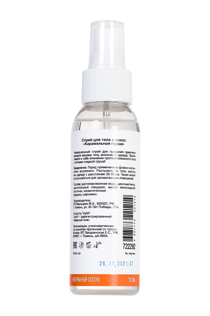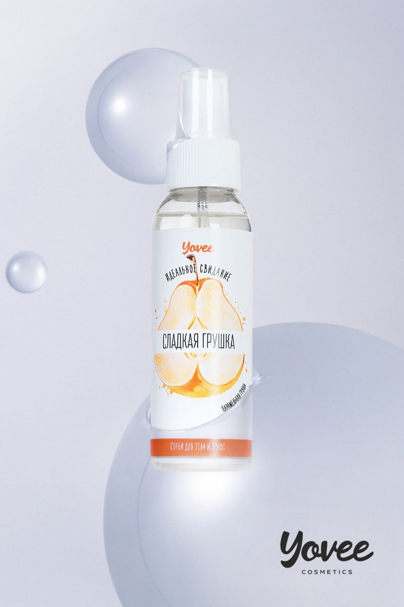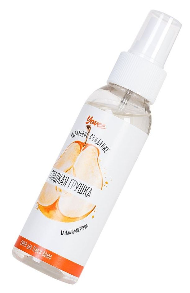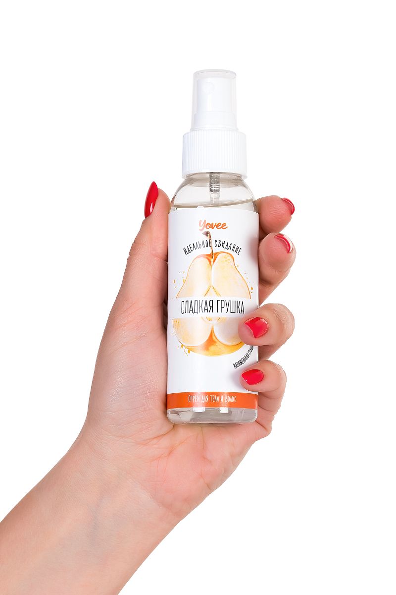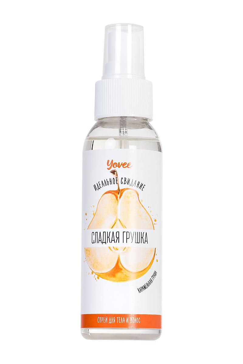 Спрей для тела и волос «Сладкая грушка». Универсальный спрей для придания приятного аромата вашему телу, волосам и одежде. Вы станете настоящим лакомым десертом, благодаря сладкому запаху карамельной груши. Притягивайте к себе внимание противоположного пола с нотками сладкой груши! Подготовка к свиданию: нанесите спрей на тело и волосы подарите своему партнеру приятные ароматы для волнующего флирта. Нанесите спрей на нижнее и постельное белье и наслаждайтесь летными ароматами вместе с партнером.