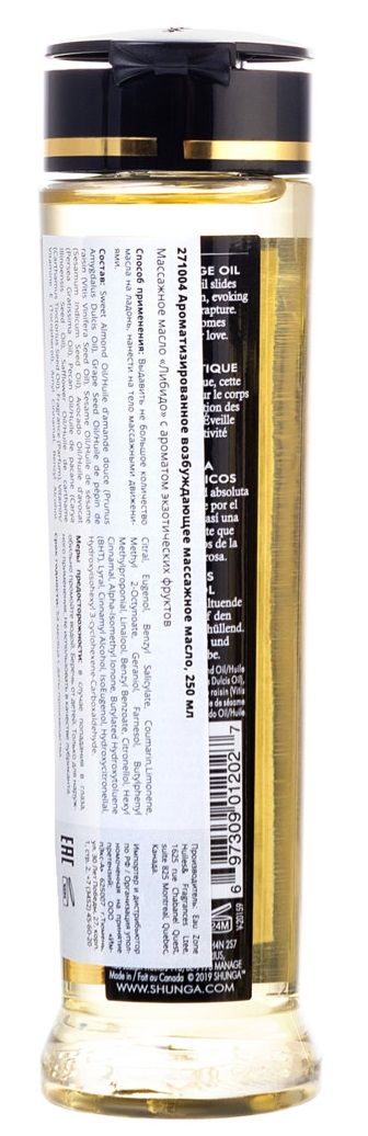 Несъедобное массажное масло Shunga Erotic Massage Oil с ароматом экзотических фруктов. 100% натуральные масла холодного отжима. Витамин Е (антиоксидант). Без жирных следов на коже. Не забивает поры. Нет минерального или животного масла в составе. Масло легко скользит по коже, в то время как экзотические ароматы поднимут ваши чувства до вершин возбуждения... Идеально подходит для того, чтобы насладиться расслабляющим массажем. Это на 100 % натуральное масло с упоительными ароматами, легко скользит по коже, не оставляя жирной пленки.