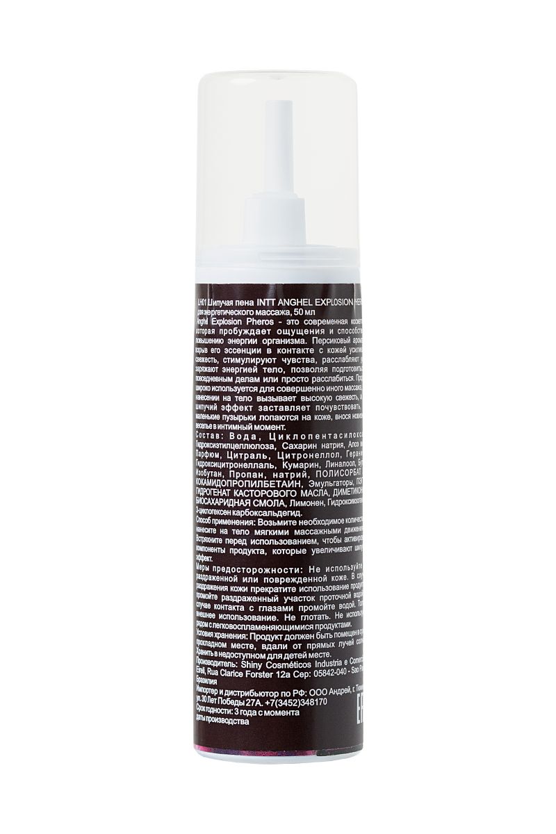 Шипучая пена Intt Anghel Explosion Pheros — универсальное косметическое средство 3 в 1, владеть которым доставляет дикое удовольствие. Великолепно подходит для эффектного массажа. Просто встряхните баллончик и нанесите пену на тело партнера. Дальше все сделает шипучка с охлаждающим эффектом. Тысячи неуемных пузырьков начнут волновать кожу, плавно взрываясь и щекоча ее. А легкое ощущение холодка пробудит желание отдаться эксперименту полностью. Отлично расслабляет. Заряжает кожу энергией и снимает напряжение после долгого тяжелого дня. Превосходно освежает после душа. Безопасный состав с натуральными ингредиентами из выжимки бразильских растений изумительно увлажняет кожу, делая ее свежее, мягче и нежнее. Любите себя каждый день вместе с Intt Anghel Explosion Pheros.
