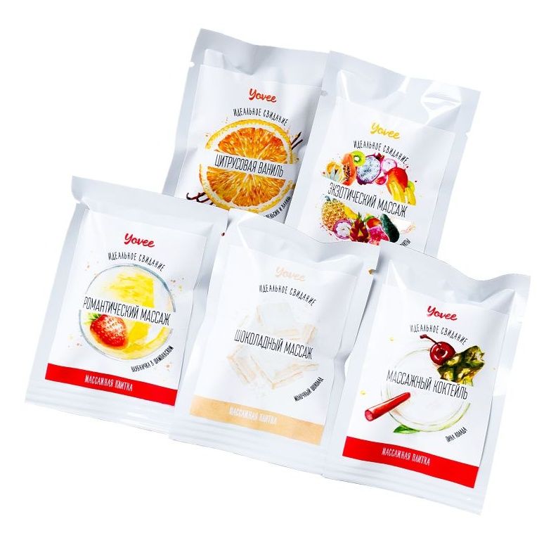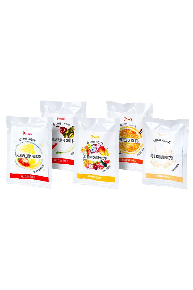 Набор из 5 массажных плиток Yovee. В набор входит 5 ароматов: ваниль, клубника и шампанское, пина колада, тропические фрукты, молочный шоколад. Натуральные масла в составе сделают массаж не только насыщенным и чувственным, но и полезным для вашей кожи. Отлично скользит и смывается водой. Идея для свидания: удивите свою половинку массажем с новым аксессуаром. Маленькой плиткой начните проводить по его телу, обязательно проходя через самые чувственные места. Когда плитка растает, продолжайте массировать тело руками. Такой сюрприз непременно понравится вашему партнеру!