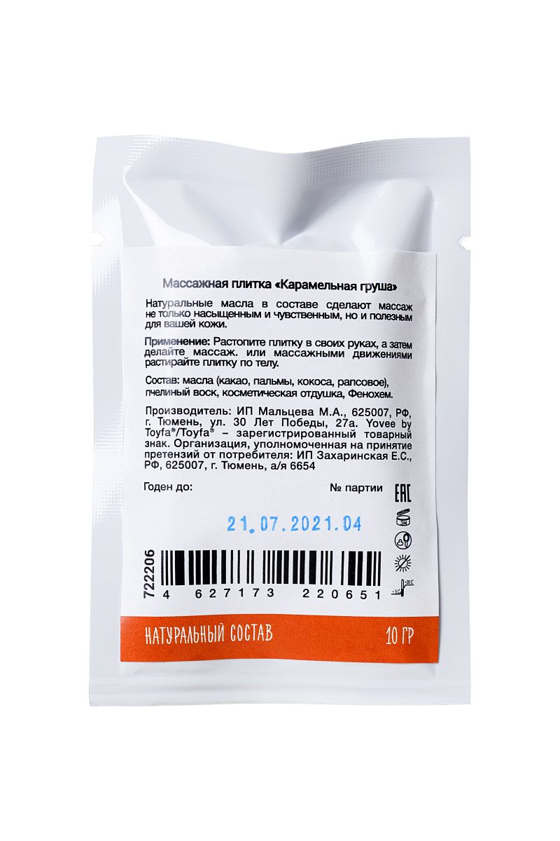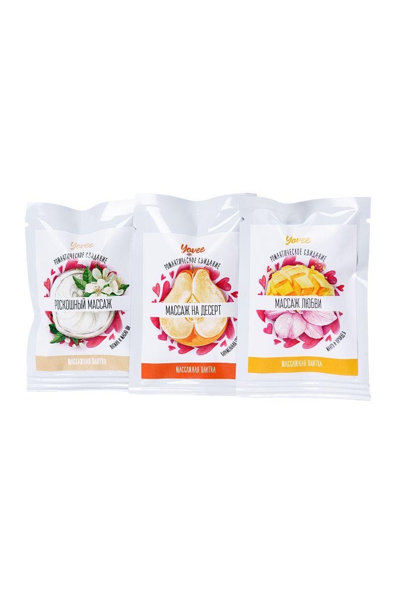В набор входит 3 аромата: карамельная груша, жасмин и масло ши, манго и орхидея. Натуральные масла в составе сделают массаж не только насыщенным и чувственным, но и полезным для вашей кожи. Отлично скользит и смывается водой. Идея для свидания: удивите свою половинку массажем с новым аксессуаром. Маленькой плиткой начните проводить по его телу, обязательно проходя через самые чувственные места. Когда плитка растает, продолжайте массировать тело руками. Такой сюрприз непременно понравится вашему партнеру!