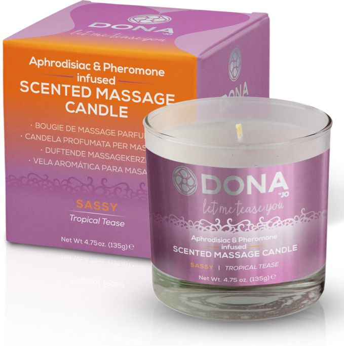 Массажная свеча DONA Scented Massage Candle Tropical Tease с тропическим ароматом Sassy (мангостин, мандарин, жасмин) - необходимый атрибут романтического вечера. Нежное пламя и искрящийся оттенок создают эротический полумрак. Манящий аромат феромонов и афродизиаков витает в воздухе, пробуждая обоюдную неудержимую страсть. Всё помещение наполняется теплым опьяняющим ароматом желания. Подождите немного, пока растопится соевое масло, погасите пламя любви и на расстоянии от нежного тела капните каплю волшебного тепла, и начинайте массаж. Массажные движения должны быть чувственными: поглаживания, растирания, лёгкие похлопывания.