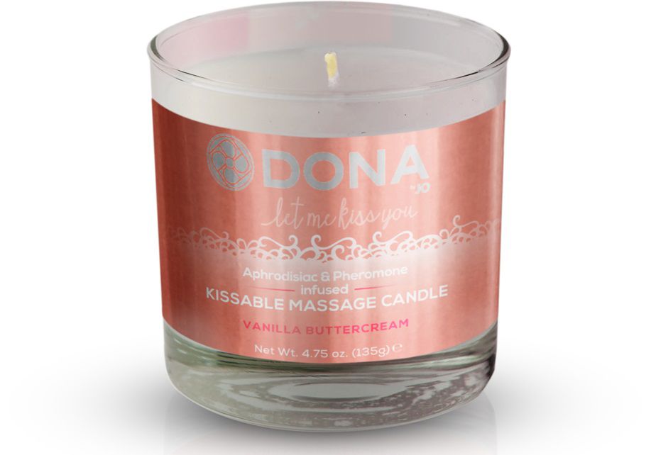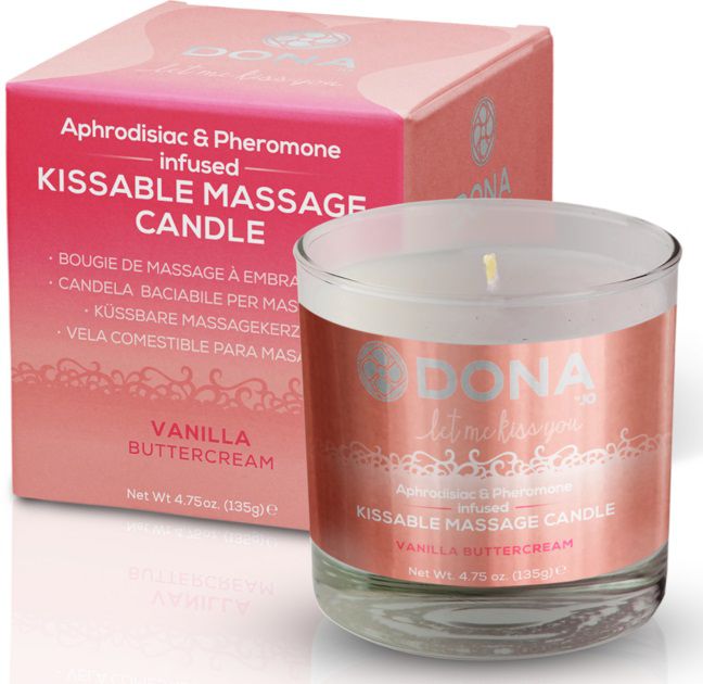 Вкусовая массажная свеча DONA Kissable Massage Candle Vanilla Buttercream с ароматом ванильного крема - необходимый атрибут романтического вечера. Нежное пламя и искрящийся оттенок создают эротический полумрак. Манящий аромат феромонов и афродизиаков витает в воздухе, пробуждая обоюдную неудержимую страсть. Всё помещение наполняется теплым опьяняющим ароматом желания. Подождите немного, пока растопится соевое масло, погасите пламя любви и на расстоянии от нежного тела капните каплю волшебного тепла, и начинайте массаж. Массажные движения должны быть чувственными: поглаживания, растирания, лёгкие похлопывания и, конечно же, страстные поцелуи.