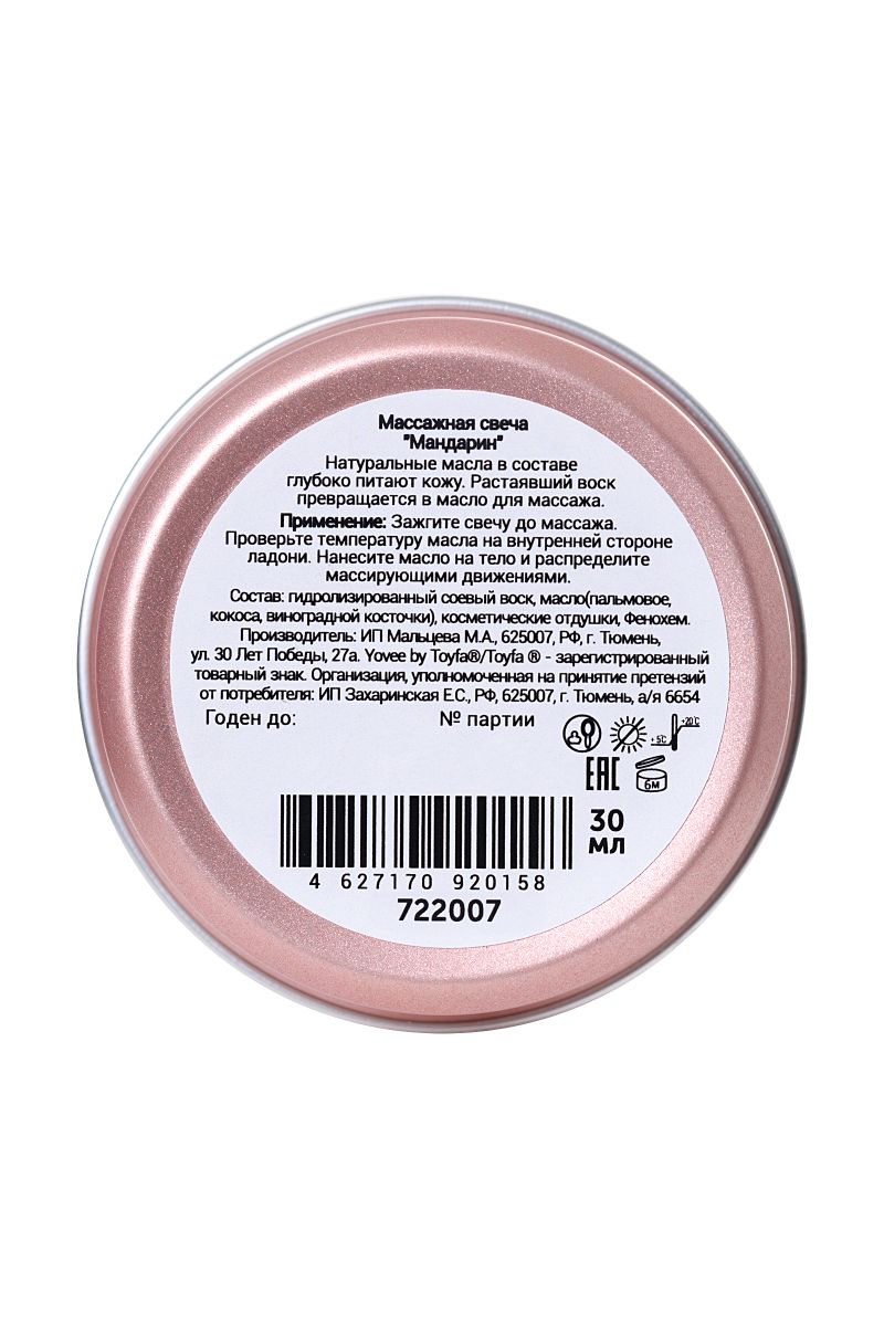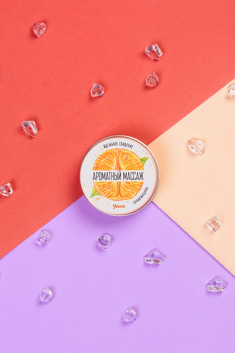 Натуральные масла в составе глубоко питают и увлажняют кожу. Растаявший воск превращается в масло для массажа. Свеча станет идеальным аксессуаром для романтического свидания. Идея для свидания: В выходной день предложите своей половинке взбодриться цитрусовыми соками и бодрящим массажем с ароматом мандарина. Предложите партнеру расслабиться в ожидании массажа. Затушите свечу и немного подождите, пока масло остынет. Лейте масло вдоль спины медленно, а затем начните с лёгких массирующих движений. Сделайте массаж своим обнажённым телом — так он станет ещё более интимным и чувственным. Такое свидание останется в памяти надолго! Свеча подарит незабываемые ощущения, после которых вам гарантированы нежные и мягкие прикосновения!