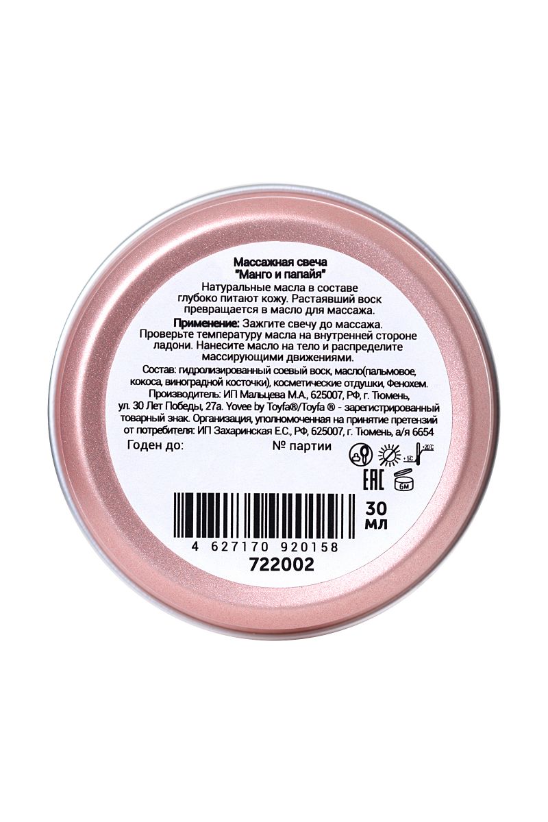 Натуральные масла в составе глубоко питают и увлажняют кожу. Растаявший воск превращается в масло для массажа. Свеча станет идеальным аксессуаром для романтического свидания. Идея для свидания: приготовьте фруктовую тарелку и предложите партнеру окунуться в атмосферу отпуска. Зажгите массажную свечу. Предложите партнеру расслабиться в ожидании массажа. Погасите свечу и немного подождите, пока масло остынет. Лейте масло вдоль спины медленно, а затем начните с лёгких массирующих движений. Сделайте массаж своим обнаженным телом — так он станет ещё более интимным и чувственным. Такое свидание останется в памяти надолго! Свеча подарит незабываемые ощущения, после которых вам гарантированы нежные и мягкие прикосновения! Зажгите свечу до массажа. Когда образуется достаточное количество масла, погасите её. Проверьте температуру масла на внутренней стороне ладони, при необходимости дайте маслу немного остыть. Нанесите разогретое масло на тело и массирующими движениями распределите по телу.