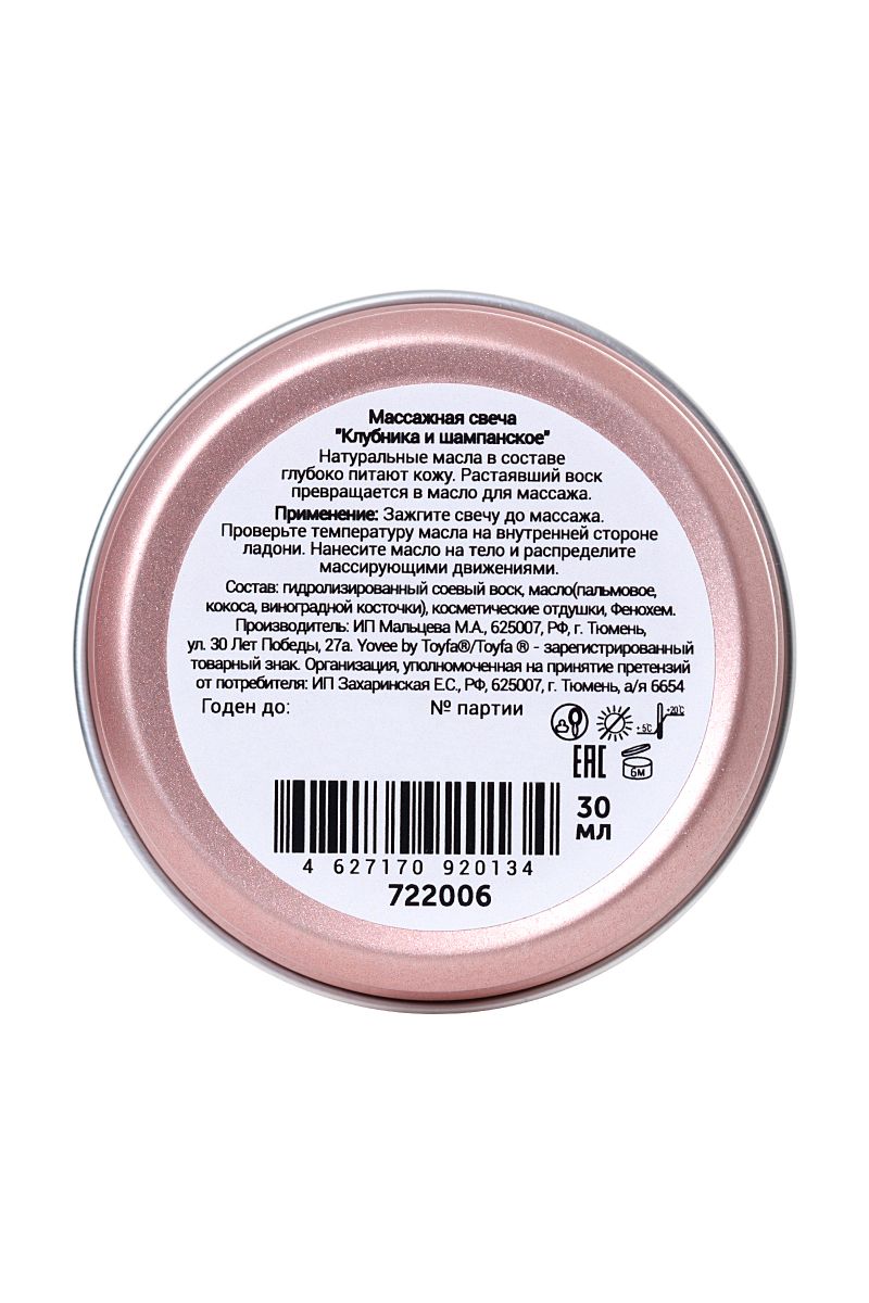 Натуральные масла в составе глубоко питают и увлажняют кожу. Растаявший воск превращается в масло для массажа. Свеча станет идеальным аксессуаром для романтического свидания. Идея для свидания: если у вас есть повод для праздника или просто игривое настроение - организуйте свидание со свежей клубникой и шампанским. Массажная свеча с таким же ароматом будет отличным продолжением свидания. Зажгите свечу и подождите, пока образуется масло. Лейте масло вдоль спины медленно, а затем начните с легких массирующих движений. Сделайте массаж своим обнаженным телом - так он станет еще более интимным и чувственным. Такое свидание останется в памяти надолго! Свеча подарит незабываемые ощущения, после которых вам гарантированы нежные и мягкие прикосновения!