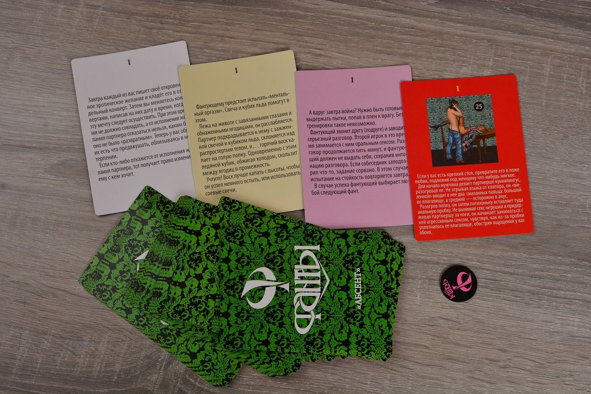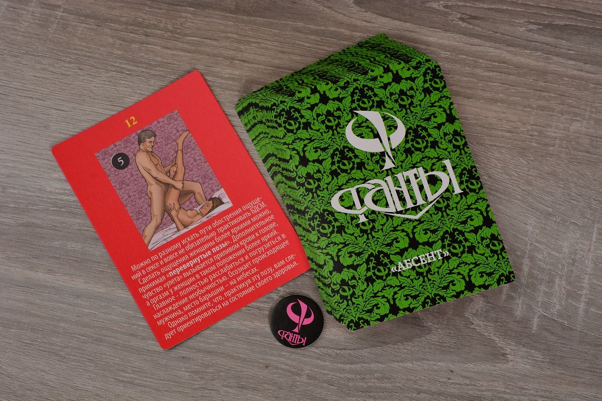 Готовы к удовольствиям? Вы когда-нибудь мечтали по-настоящему потерять голову? С коробкой фантов «Абсент» это очень просто сделать: достаточно выключить голову и начать выполнять задания. Все это вы уже видели в кино, а часть, вероятно, даже пробовали. Но ведь каждое эротическое приключение совершенно уникально! Так что смело открывайте коробку и начинайте... получать удовольствие. Секрет для двоих Производители предлагают начать игру в кровати. Но учтите, далеко не все задания вы сможете выполнить тут же. Некоторые растянутся на несколько дней, украсив серые будни ожиданием эротического праздника. Клубника, шампанское, поцелуи Насколько неприлична эта игра? Ровно настолько, насколько может быть раскованным в постели. Если вы готовы только слегка пошалить, то берите самые безобидные задания — фанты белого и желтого цвета. Если же вы готовы удивляться и удивлять, а также пробовать новое, необычное и оттого еще более возбуждающее — смело тяните розовые и красные карточки. Готовьте инвентарь Среди фантов попадаются задания, для выполнения которых потребуются особые предметы. Есть совсем простые и привычные, а есть те, что в обычном супермаркете не купишь. Так что разыграв половину колоду, вполне вероятно, вы захотите большего и отправитесь в секс-шоп за любопытными игрушками. Впрочем, это совсем необязательно, чтобы получить удовольствие от игры. Все зависит только от ваших желаний. Кто не устоит перед искушением? Любители «погорячее»: все те, кто давно мечтал попробовать, но еще не успел Настоящие игроки: что может быть увлекательнее, чем играть в постели? При этом выигрыш — гарантирован. Пары, уже попробовавшие многое: готовы к новым экспериментам? Разве нужен повод? Скоро годовщина? Откажитесь от дежурных подарков в пользу Фантов-Абсент, которые сделают счастливыми вас обоих День Святого Валентина: этому подарку он точно будет рад. Впрочем, не меньше, чем она. Волшебный набор: 48 карточек с заданиями разной степени эротичности фишка для жеребьевки (кто будет тянуть фант) правила игры с рекомендациями по проведению увлекательного вечера подсказки по позам.