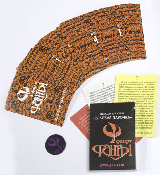 Игра «СЛАДКАЯ ПАРОЧКА» — настоящая «бомба» для скуки в интимных отношениях. «Подлить масла в огонь», превратив типичный отпуск пары в невероятно романтическое приключение, — вот ее основная задача. То, что вы вряд ли позволите себе дома, можно и нужно устроить на отдыхе. Помните, что привычки — главный враг близости, а однообразие убивает любую любовь. Игра «СЛАДКАЯ ПАРОЧКА» — самая эротическая из серии игр для взрослых «Фанты-Флирт», так как ее цель: добавить романтики, разнообразия, вкуса эротики и страсти в интимную жизнь семейных и постоянных пар. Она поможет не только весело и необычно провести типичный отпуск, но использовать его как повод для старта «новой жизни». Не важно, где вы отдыхаете: на курорте, даче, в деревне, туристической поездке или путешествии. Надо просто взять эту игру с собой в поездку, и она превратится в медовый месяц, романтическое путешествие или эротический уикенд. В этой игре пятьдесят фантов-заданий, разбитых на три уровня раскованности и свободы в интимных отношениях. Вытяни фант, исполни желание — в этом заключается суть этой увлекательной и захватывающей игры, а переходя в ней от одного задания к другому, вы все больше и больше будете отпускать «заржавевшие тормоза», забывая про однообразие и опасную для любви привычку в постели. Играйте с любимым человеком, доставляйте друг другу удовольствие, и вашим отношениям никогда не придется проходить проверку на прочность! Эротическая игра для двоих «СЛАДКАЯ ПАРОЧКА» — идеальный «путеводитель» в свадебном путешествии молодоженов, или недорогой, но очень оригинальный подарок на свадьбу. На коробке с игрой размещен текст, содержащий дополнительные рекомендации, а также подробно поясняющий, чем интересна игра «СЛАДКАЯ ПАРОЧКА», в чем ее особенность и актуальность. Сама игра, по сути, состоит их колоды, содержащей 50 фантов-заданий для непосредственного проведения игры. Фанты разделены на три цвета (уровня «жесткости» заданий), среди которых есть и по-настоящему экстремальные, но именно поэтому она не даст скучать никому. В коробочку с колодой дополнительно вложена специальная фишка для проведения жеребьевок.