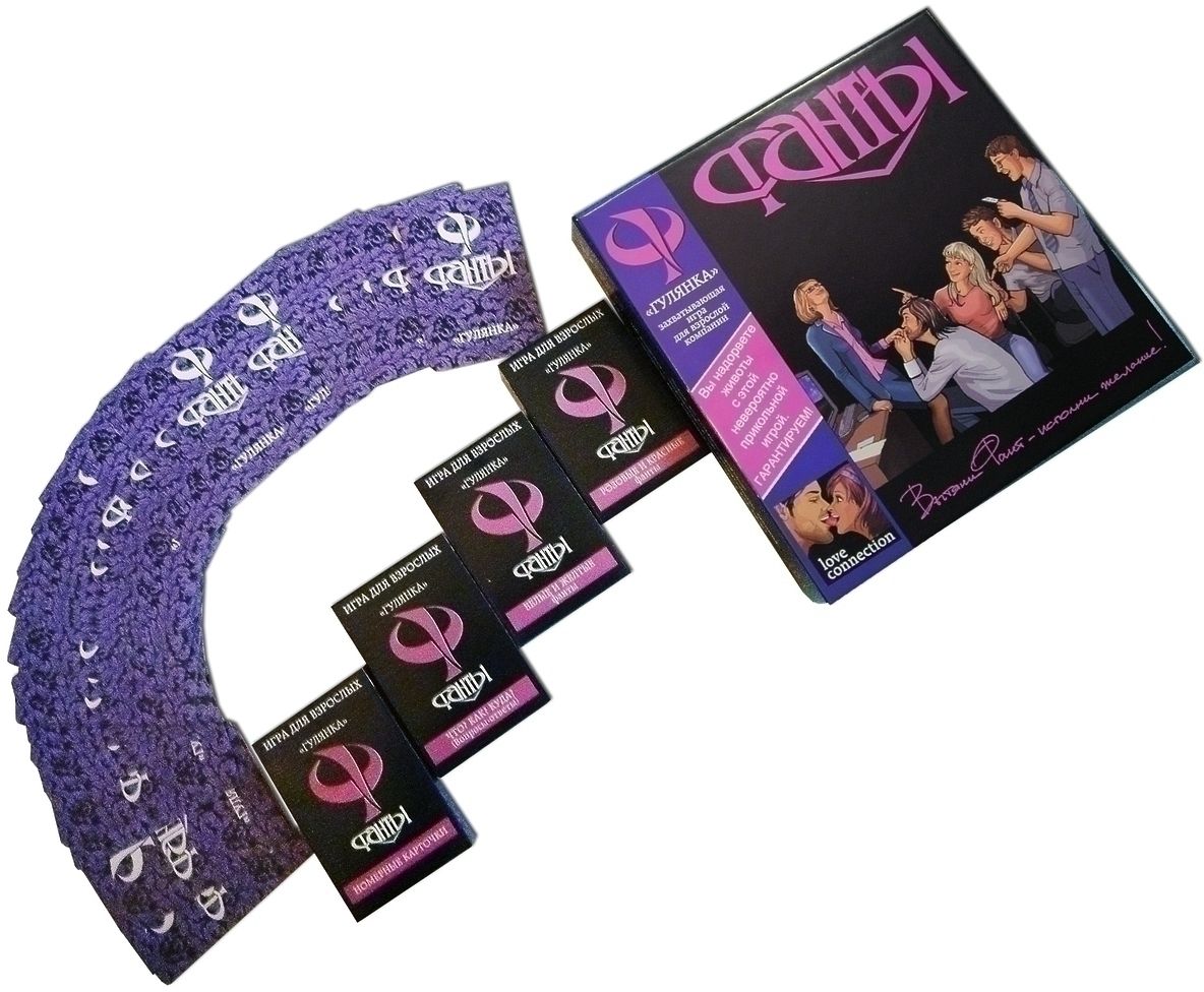 Фанты «ГУЛЯНКА» — уникальный СЦЕНАРИЙ проведения ВЕЧЕРИНОК. Это – необычайно ЗАХВАТЫВАЮЩАЯ и ВЕСЕЛАЯ игра для взрослой компании. Сделанная специально для проведения КОРПОРАТИВНЫХ ВЕЧЕРИНОК, она прекрасно подойдет и для любых «посиделок» теплой КОМПАНИЕЙ. Главное, что бы в ней не было людей без чувства юмора или чрезмерно стеснительных. Таким «Гулянка» противопоказана. НОВОГОДНЯЯ ВЕЧЕРИНКА, празднование 8-го МАРТА или Дня Святого Валентина, в общем, любое корпоративное мероприятие или вечеринка компанией всегда требуют организации. Массовики-затейники, инициативные активисты, вино-водка-шампанское... Многим это порядком надоело. С игрой «ГУЛЯНКА» все будет значительно ВЕСЕЛЕЕ и НЕФОРМАЛЬНЕЙ. Вы быстро и легко организуете потрясающую вечеринку! Единственная проблема — у некоторых на следующий день будут болеть животы от смеха. ИГРА НУЖНА тем, кто: - хочет разнообразить праздничные «корпоративы» - ищет готовый сценарий веселых и нестандартных вечеринок - любит повеселиться с друзьями или коллегами по работе - хочет внести свежую струю в традиционные коллективные посиделки. С этой игрой вы БЫСТРО и ЛЕГКО организуете потрясающую вечеринку, не зависимо от того, корпоративная она или просто дружеская! «ГУЛЯНКА» — по-настоящему УНИКАЛЬНАЯ ИГРА. Ведь, кроме авторских разработок и обобщения многочисленных идей, в нее включено все лучшее, что есть в первой десятке самых популярных зарубежных игр для взрослых. Игра заключается в ответах на вопросы и выполнении заданий, написанных на карточках-фантах. При этом выполняющие задание игроки определяются жеребьевкой. Игра «ГУЛЯНКА» рассчитана на любую компанию от четырех до 100 человек и позволяет самым разнообразным образом варьировать «сценарий проведения мероприятия» в зависимости от особенности состава ее участников. Она включает карточки с сотней «горячих» вопросов-ответов, а также 100 фантов — карточек с необычайно увлекательными заданиями-розыгрышами. В состав коробки с игрой входят: - колода, содержащая 50 карточек для проведения жеребьевок - колода с сотней вопросов – ответов - две колоды с сотней игровых заданий (по 50 в каждой) - инструкция с порядком подготовки и проведения игры - таблица «хода игры», помогающая ее проводить.