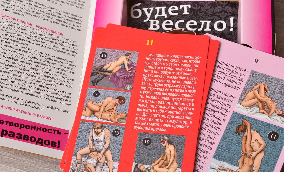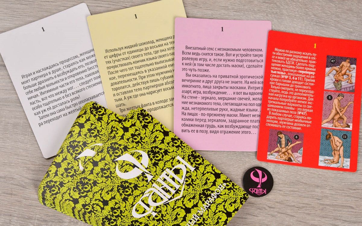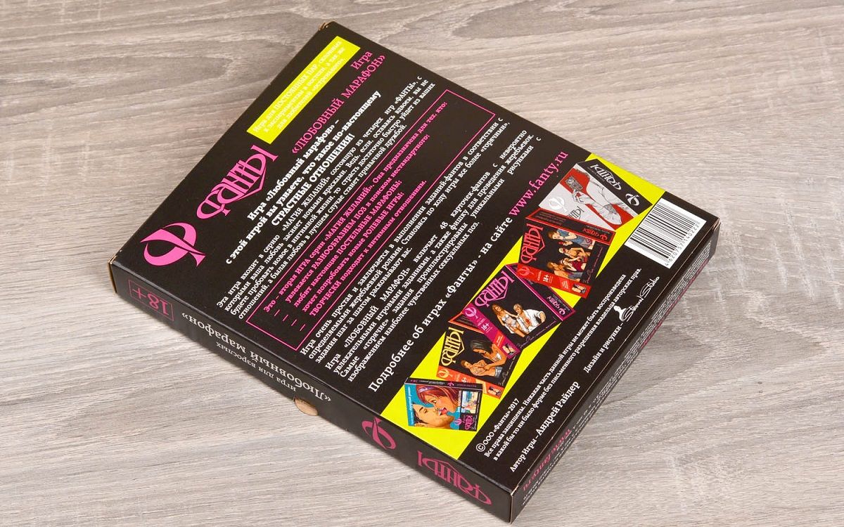 Готовы поиграть? Если вы знаете, что ролевые игры — это не только переодевание в эльфов и магов. Если вы не против протестировать на практике гибкость своего тела. И погрузиться с головой в увлекательную эротическую игры... Забудьте о приличиях и смело открывайте коробку с «Любовным марафоном». Дрожать можно не только от холода В небольшой коробочке — почти полсотни приятных заданий. Начните с самых «невинных», белых, фантов. А когда почувствуете, что в комнате стало жарко, перейдите к следующей, уже более порочной, желтой колоде. Не торопитесь сразу взяться за розовые и красные фанты: чем длиннее прелюдия, тем ярче будет кульминация. Можно посмотреть примеры заданий? Да, примеры есть на фотографиях игры. В целом, эта коробочка фантов рассчитана на тех, кто не прочь попробовать что-нибудь новое. Большинство сексуальных заданий предлагает поиграть в ролевую игру и попробовать несколько новых поз. Подсказки нарисованы прямо на картах: так в задании со «слесарем-мебельщиком» иллюстрации подсказывают, как можно удобно устроиться вдвоем... на обычном стуле. Кто будет в восторге от такого приключения? Люди, с хорошо развитой фантазией. Все те, кто уже неоднократно придумывал себе сексуальные приключения, но так и не рискнул их воплотить. Или просто готов попробовать что-то новенькое. Пара, которая уже давно вместе. Вернуть отношениям новизну — очень просто. Нужно всего лишь забыть о том, что вы знакомы. И начать заново открывать друг друга. Любители экспериментов. «Любовный марафон» скрывает достаточно озорные задания, которые точно разнообразят сексуальную жизнь. И при этом остается довольно приличным, не предлагая ничего по-настоящему рискованного. Если вы хотите опробовать покупки из секс-шопа, скорее вас заинтересует колода «Горячие эксперименты». Что в наборе: 48 фантов четырех цветов: белые, желтые, розовые и красные фишка, чтобы определять, кто следующим тянет задание правила игры с рекомендациями, как получить от «Любовного марафона» максимум удовольствия.