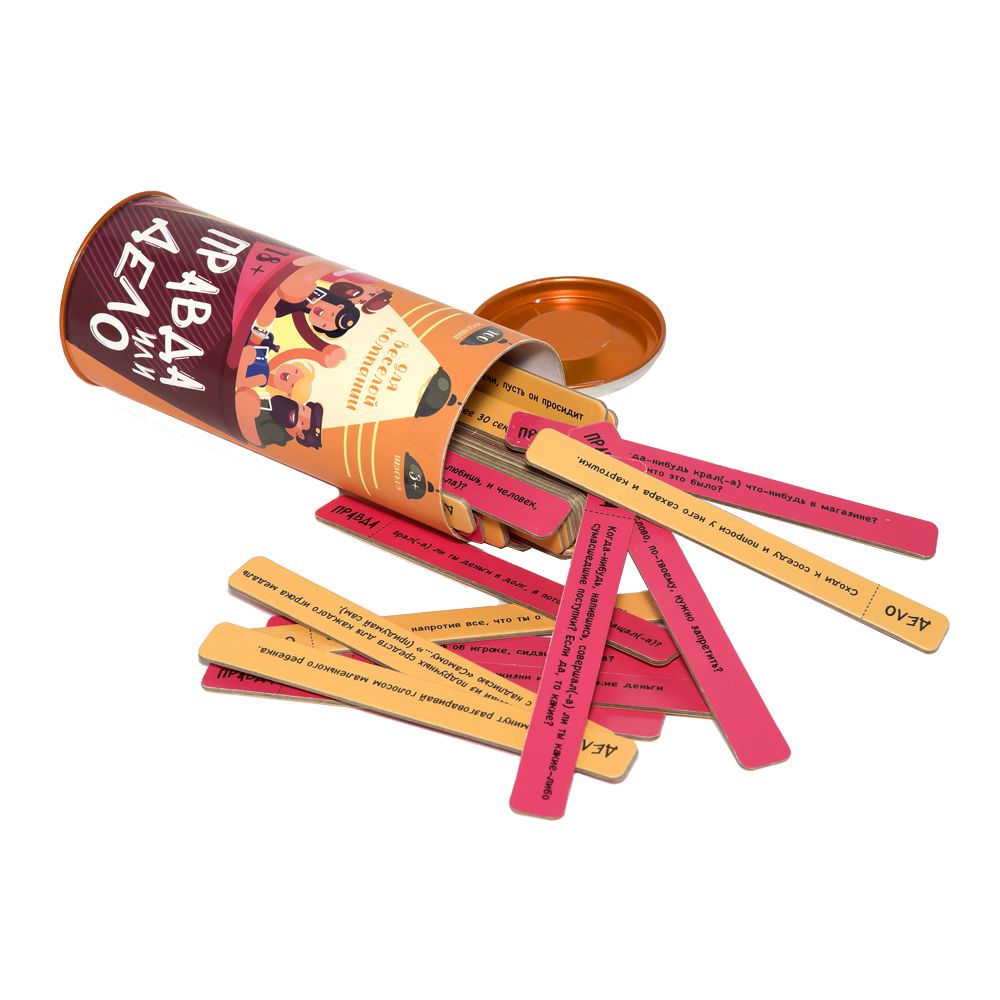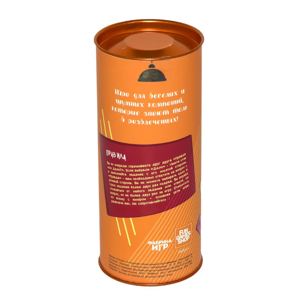 Правда или дело: Для Компании - игра, которая расшевелит любую вечеринку! Думаете, как повеселиться в баре или дома с друзьями? Надоело просто пить пиво и обсуждать одни и те же темы? В этом тубусе собраны каверзные вопросы и задания для друзей. Берите игру в бар, берите напитки и начинайте. Каждый по очереди выбирает правду или дело, тянет стик и отвечает на вопрос или выполняет задание. Выбирая Правда вы должны будете честно ответить на один из каверзных вопросов. А выбрав Дело придётся выполнить условия задания. Но не бойтесь, все сделано так, чтобы всем было весело.