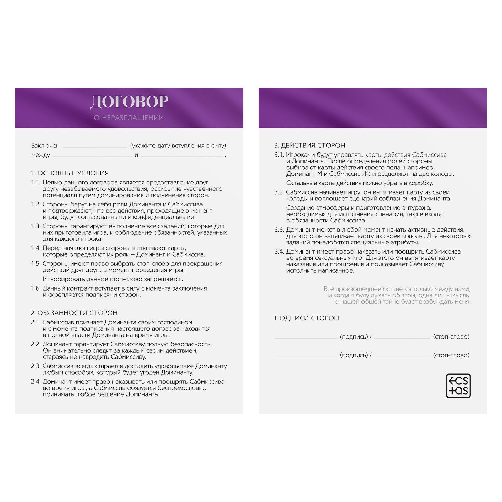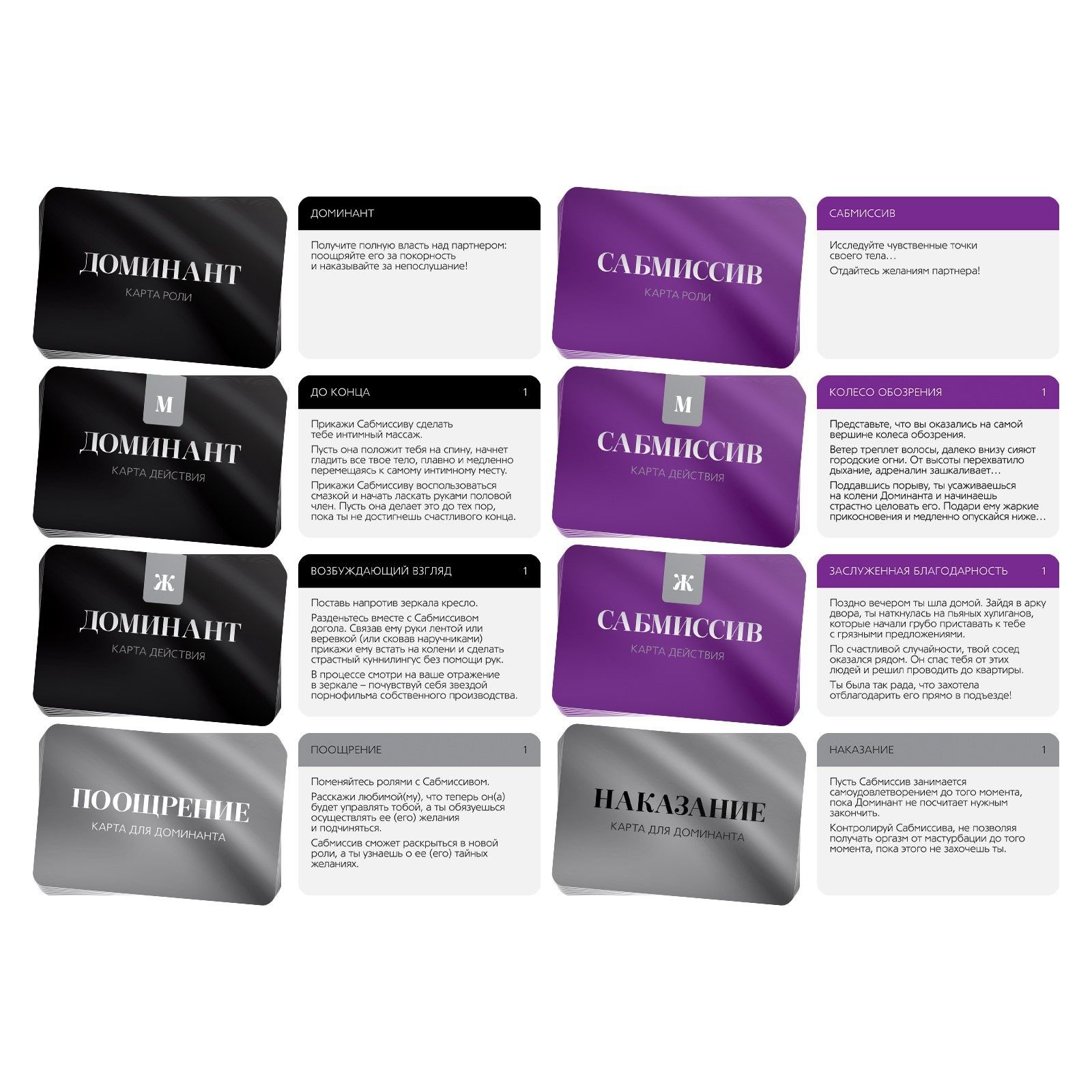 Примите участие в волнующей игре для двоих… Узнайте о новых источниках удовольствия, изучите тела друг друга, но… тс-ссс! О том, что происходит под покровом ночи, должны знать только вы. Вы готовы установить особые правила игры? Подпишите контракт о неразглашении и выберите желаемую роль. Доминант вступит в права владения телом и желаниями партнёра, а сабмиссиву предстоит покорно подчиняться и… сдерживать крики удовольствия. Закройте глаза, представьте, как лёгкое перо едва касается вашего тела, а тугая лента резко связывает руки… Попробуйте все сценарии, что предложит игра. Предметы из набора помогут достичь пика удовольствия! В комплекте: 15 карт сценариев 15 карт предметов перо маска лента плётка контракт о неразглашении.