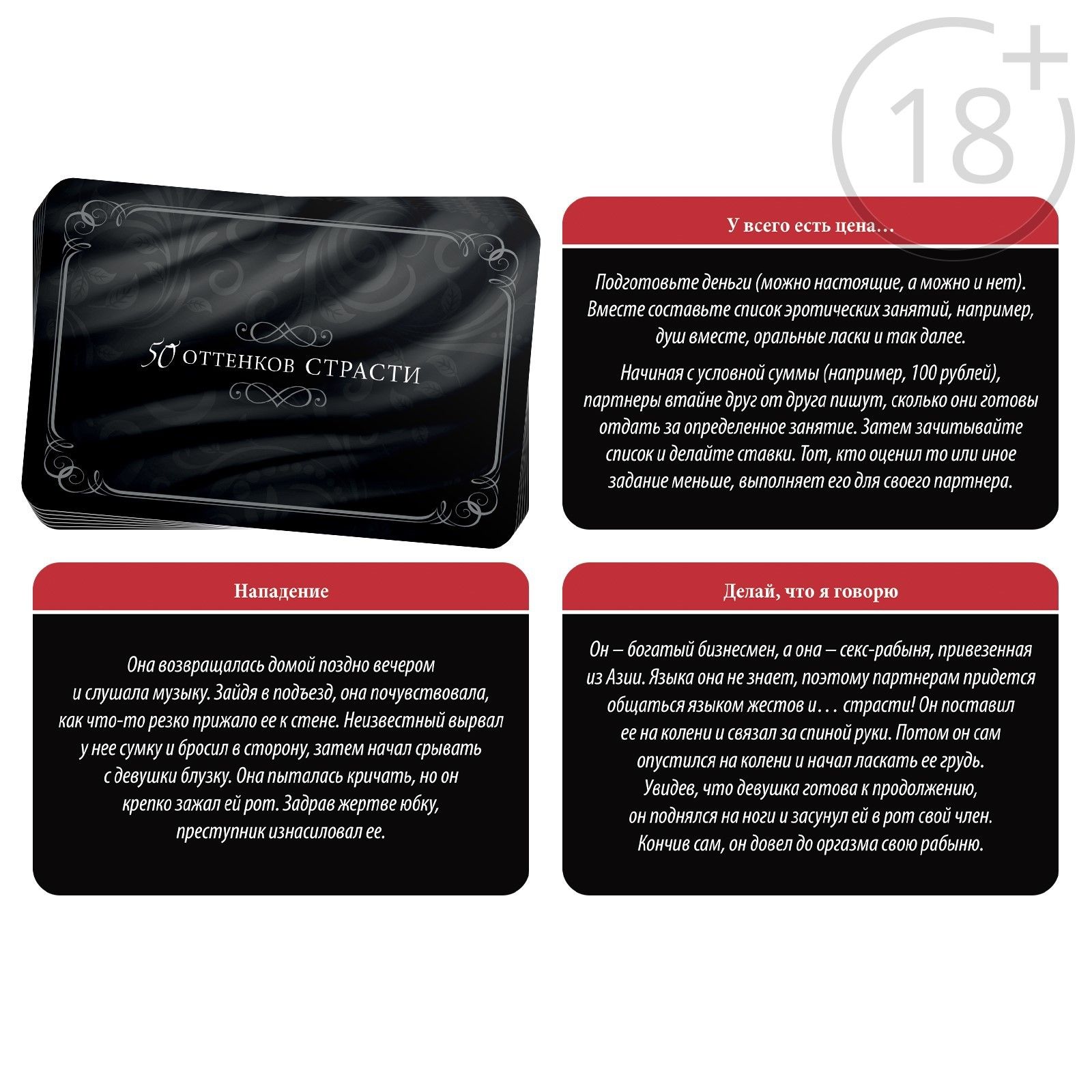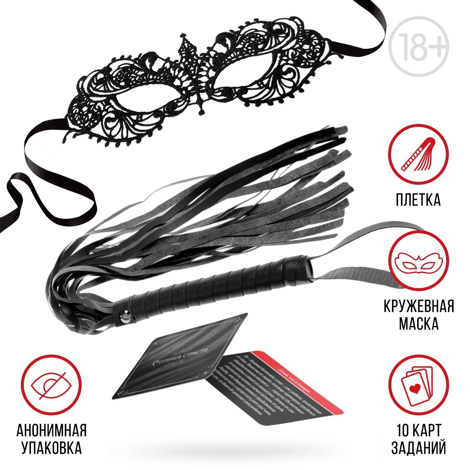 Испытайте на себе 50 оттенков страсти! Хотите испытать ещё больше новых эмоций? Перед вами игра, которая разжигает огонь желания. Вы сможете доставить друг другу незабываемое удовольствие и окунуться с головой в мир фантазий. Что нужно делать?Внутри вас ждут 10 карточек c фантами — для него и для неё. По очереди вытягивайте карточки и выполняйте то, что на них написано. А плётка и маска добавят пикантности вашей игре. В комплекте: маска, плетка,10 карт-фант.