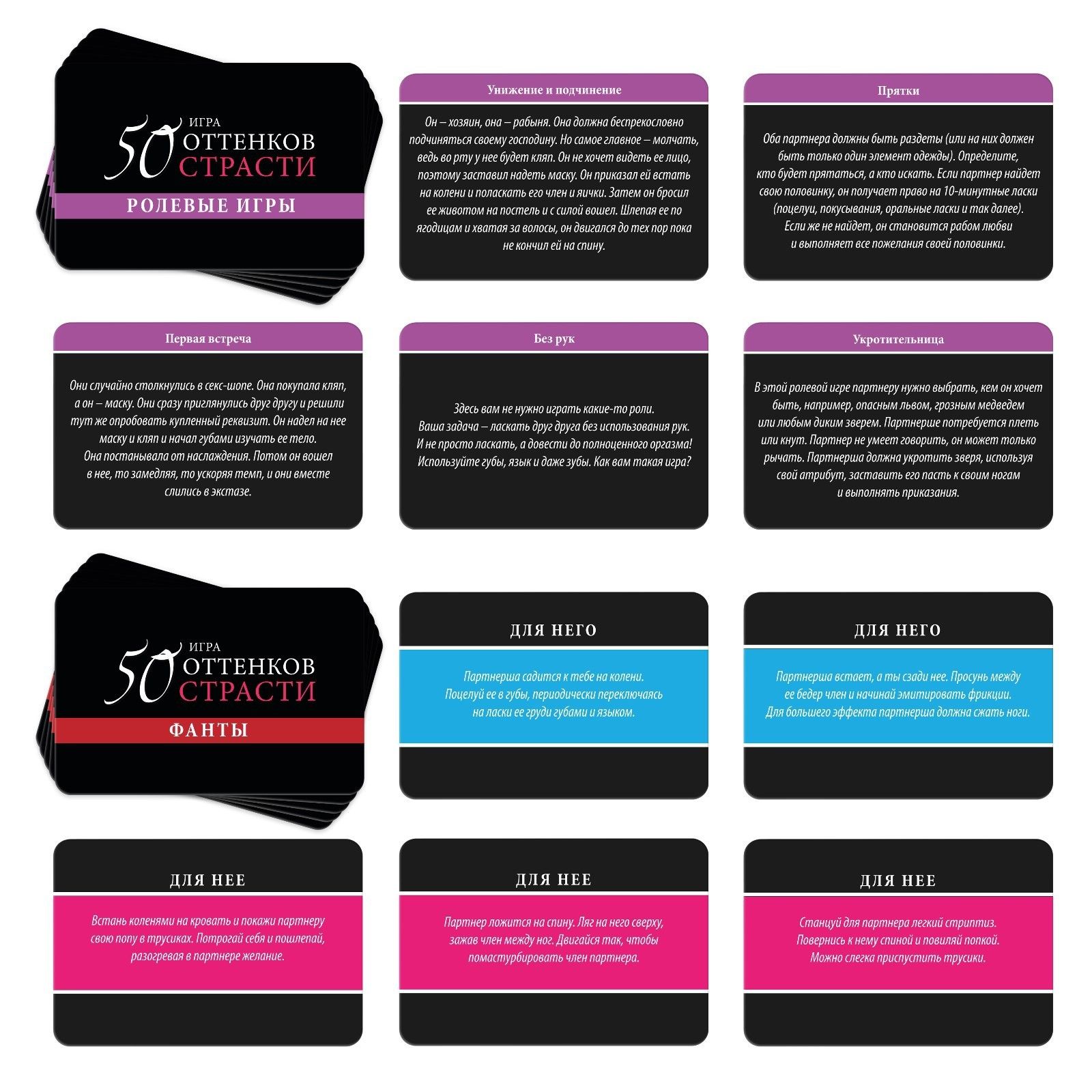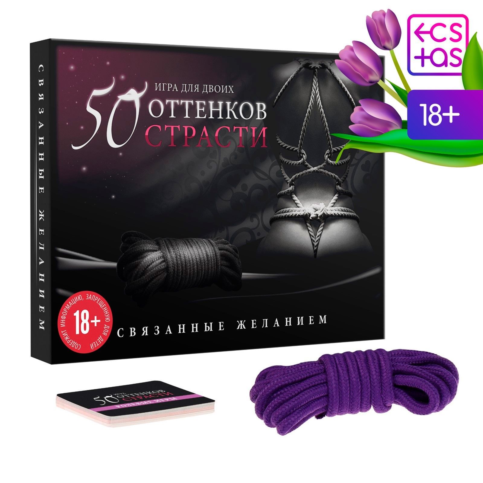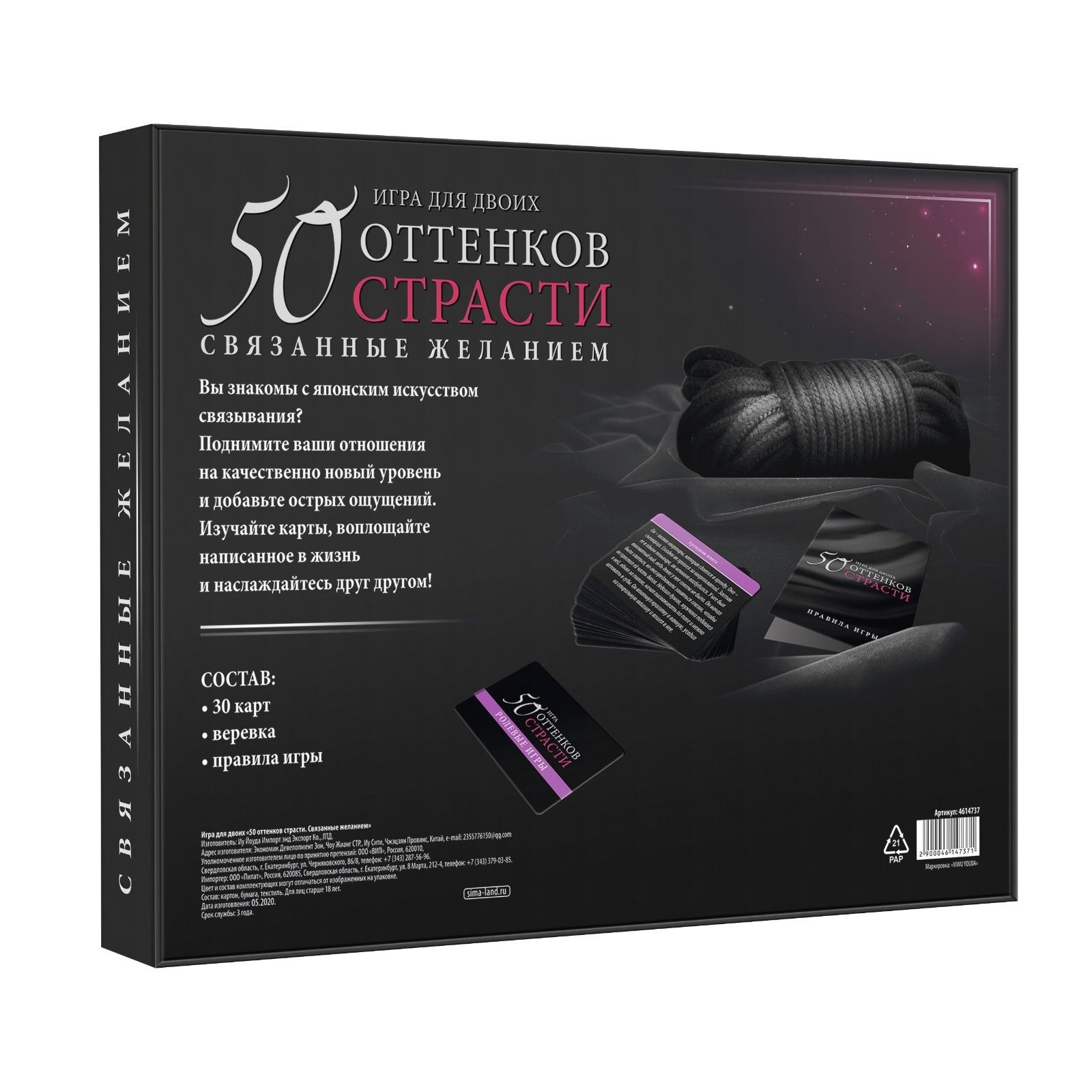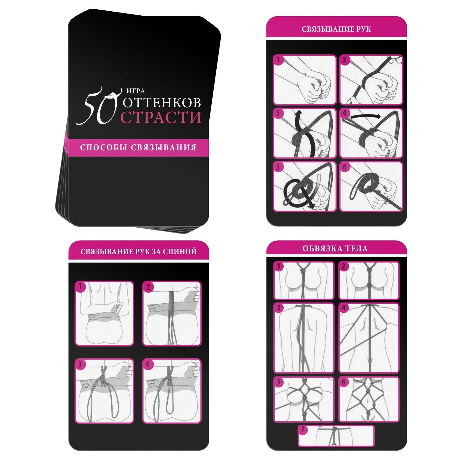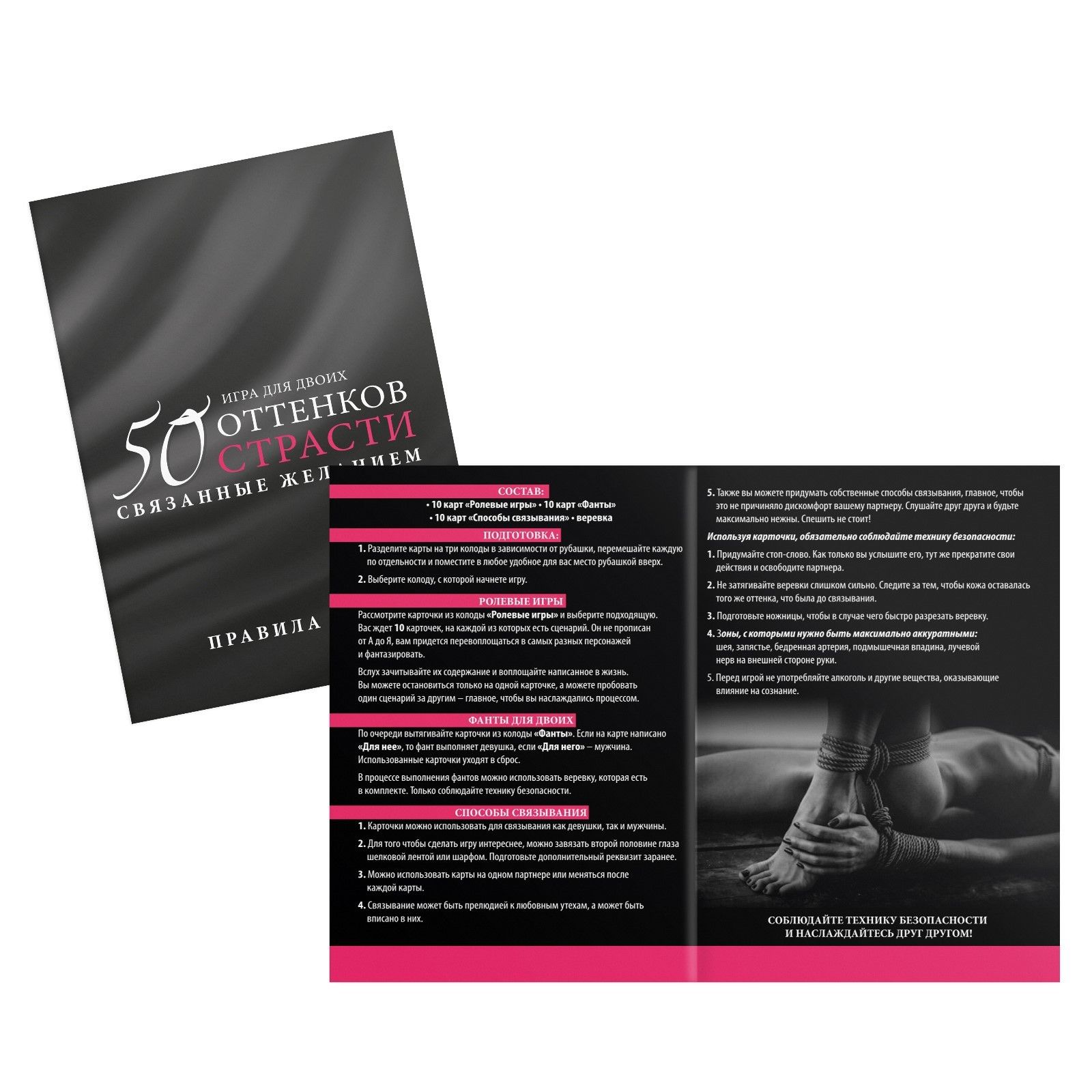 Вы знакомы с японским искусством связывания? Хотите научиться? Поднимите ваши отношения на качественно новый уровень и добавьте в них острых ощущений. Изучайте карточки, воплощайте написанное в жизнь и наслаждайтесь друг другом! Рассмотрите карточки из колоды «Ролевые игры» и выберите подходящую. Вас ждёт 10 сценариев для мужчин и женщин. Вслух зачитывайте их содержание и воплощайте написанное в жизнь. Вы можете остановиться только на одной карточке, а можете пробовать один сценарий за другим. Главное, наслаждаться процессом. По очереди вытягивайте карточки из колоды «Фанты». Если на карте написано «Для неё», то фант выполняет девушка, если «Для него» — мужчина. Использованные карточки уходят в сброс. В процессе выполнения заданий можно применять верёвку, которая есть в комплекте. Только соблюдайте технику безопасности. Связывать можно как девушку, так и мужчину. Для того чтобы сделать игру интереснее, можно завязать второй половине глаза шёлковой лентой или шарфом. Подготовьте дополнительный реквизит заранее. Можно использовать карточки на одном партнёре или меняться после каждой карты. Связывание может быть прелюдией к любовным утехам, а может быть вписано в них. Также вы можете придумать собственные способы связывания, главное, чтобы это не причиняло дискомфорт вашему партнеру. Слушайте друг друга и будьте максимально нежны. Спешить не стоит! В комплекте: 10 карт «Ролевые игры», 10 карт «Фанты», 10 карт «Способы связывания», верёвка, правила игры.