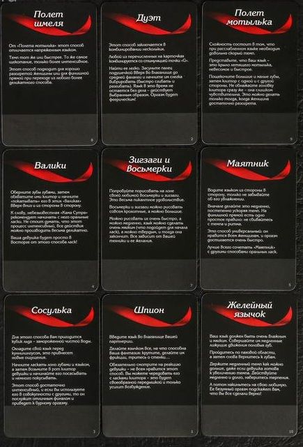 Как доставить незабываемое удовольствие девушке? Как довести мужчину до настоящего экстаза? Как достигнуть вершины наслаждения? Выбирайте колоду и открывайте для себя новую территорию страсти! Воплощайте самые смелые фантазии. Внутри вы найдёте карточки трёх видов: «Наслаждение для неё», «Наслаждение для него» и «Наслаждение для двоих». Спрячьте телефоны и настройтесь на романтический лад: включите расслабляющую музыку и наполните комнату чувственными ароматами — ничего не должно омрачать ваше настроение сегодня. Выбирайте любую карточку, выполняйте действия, написанные на ней, и доставляйте друг другу незабываемое удовольствие! В комплекте: 30 карточек, правила игры.