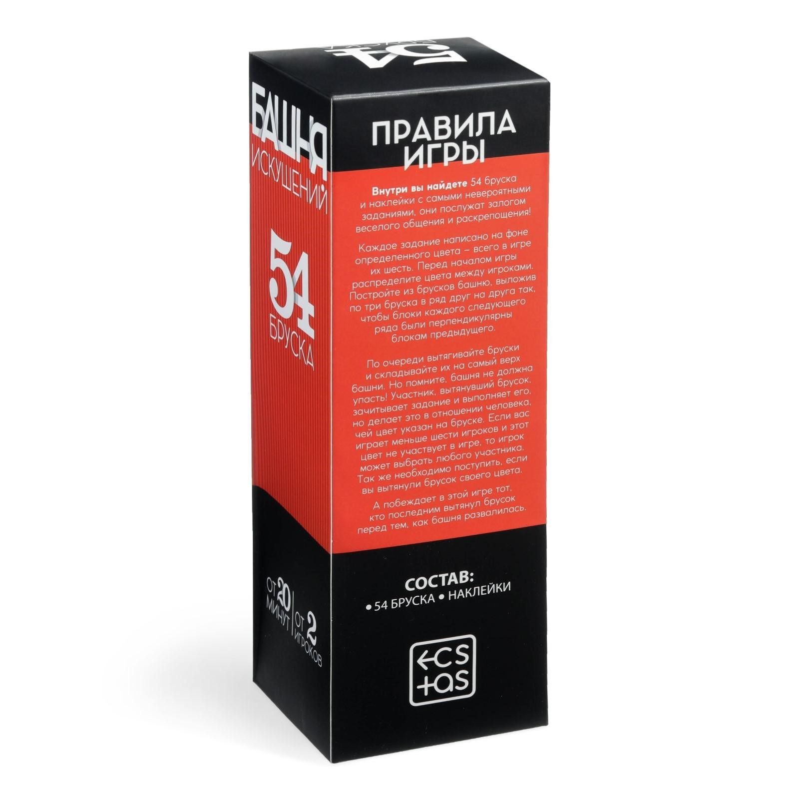 Устройте вечеринку, будоражащую ваше воображение! Постройте падающую башню, позовите друзей и выполняйте пикантные задания! В наборе вы найдёте 54 деревянных бруска с фантами, способными поднять настроение каждому! «Башня искушений» — залог общения и раскрепощения! Неожиданные задания разнообразят любой праздник! Каждое написано на фоне определённого цвета (всего их шесть). Перед началом игры распределите цвета между игроками. Постройте башню и вытягивайте бруски так, чтобы она не упала. Тот, кто вытянул деталь, зачитывает задание и выполняет его с тем игроком, чей цвет указан на бруске. Вас ждут веселье, много смеха и пикантных подробностей — устоять просто невозможно! Победит тот, кто вытягивал последним до того, как «постройка» развалится! Возьмите Башня искушений : на день рождения, вечеринку, встречу с друзьями. В набор входят 54 деревянных бруска с фантами (7 х 1,8 х 2,2 см).