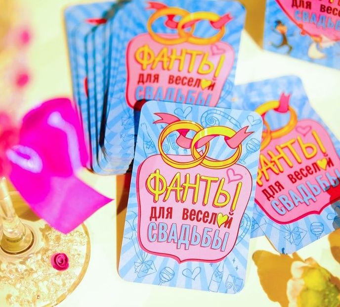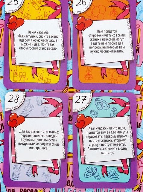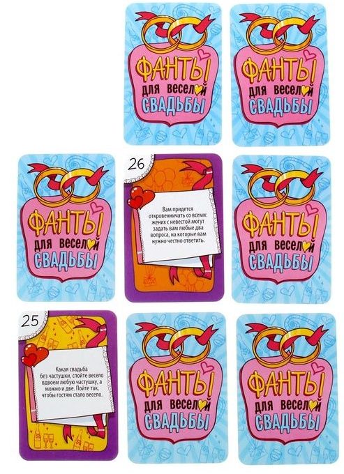 Найден секрет лучшего бракосочетания – фанты для веселой свадьбы! Хотите, чтобы ваш праздник стал самым ярким и незабываемым? Мы подготовили для вас набор, в котором собраны самые лучшие и веселые конкурсы и забавы. Отличное настроение гарантировано! Разложите карточки рубашками вверх и вытягивайте по очереди по две, одну за другой. Если карточки совпали – читайте и выполняйте задание. Нет – кладите обратно и передавайте ход другому игроку. Совпавшие карточки игрок забирает себе и имеет право еще на один ход. Не забудьте! Карточки не перемешиваются и обратно кладутся на свои места, поэтому, запомнив их расположение, вы сможете одержать победу! Не хотите играть на очки – просто выполняйте задания и получайте удовольствие! В комплекте: 60 карточек, правила игры.