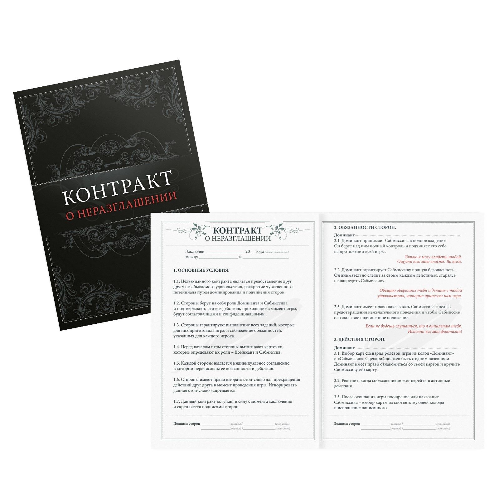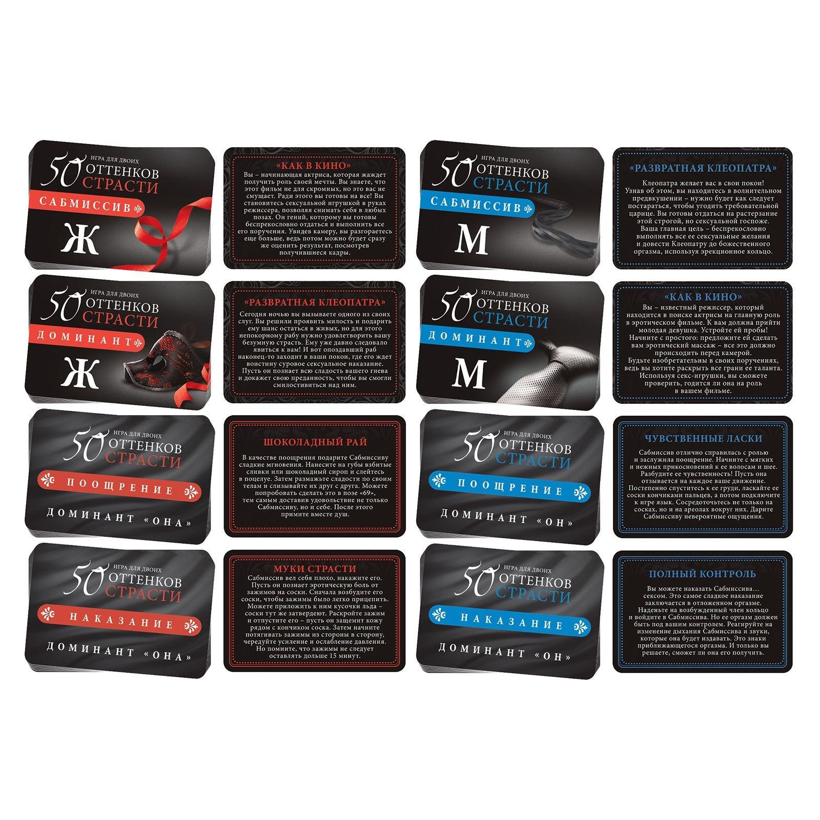 Хотите окунуться в мир, полный безумной страсти? Перед вами игра, разжигающая огонь желания. Вы сможете доставить друг другу незабываемое удовольствие и раскрыть чувственный потенциал путём доминирования и подчинения. Для начала распределите роли и вручите друг другу по контракту. Кто-то из вас будет доминантом, а другой — сабмиссивом. Разыграйте один из жарких ролевых сценариев. А после решите, поощрения или наказания заслуживает сабмиссив. Вытягивайте карточки из соответствующих колод и воплощайте все фантазии в жизнь! А испытать наивысшее наслаждение от игры вам помогут горячие аксессуары. В комплекте: 2 контракта 2 карты роли 14 карт поощрения 14 карт наказания 20 карт ролевых игр анальный стимулятор зажимы для сосков эрекционное кольцо.