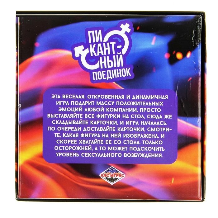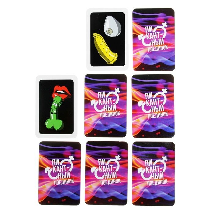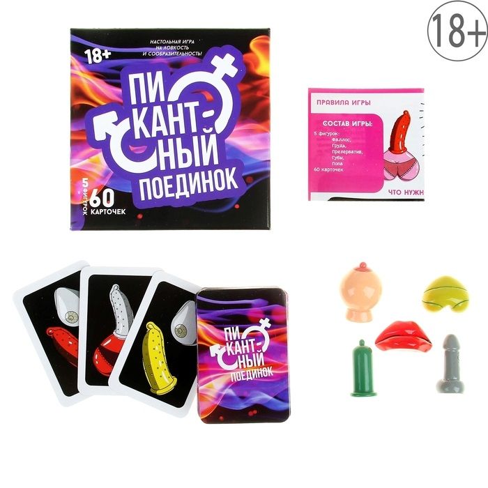 Азарт в крови, глаза горят и к настроению +100! Любая шумная компания не останется равнодушной! Только осторожней, а то от возбуждения уже не будет сил сдержаться! Попа, губы, презерватив... Всё должно быть в зоне досягаемости! Перед началом игры поставьте все пять фигурок на столе по кругу. Самое главное, расположите фигурки так, чтобы всем было удобно до них дотянуться. Все карточки хорошенько перетасуйте и положите рубашкой вверх в одну стопку рядом с фигурками. Все мысли прочь, скорей хватай то, что и остальные не прочь! Первый игрок начинает игру и переворачивает верхнюю карточку из колоды так, чтобы все игроки одновременно ее увидели. А дальше каждый сам за себя, нужно быстрее всех схватить нужный предмет – ту фигурку, которая изображена на карточке! Кто сделает это первым, забирает карточку себе, а фигурку необходимо вернуть обратно. Если на карточке нет ни одной правильной фигурки нужного цвета, то важно быстро схватить фигурку, которой нет на карте, или цвет, которого там тоже нет. Победителем станет тот, кто соберет наибольшее количество карточек! В комплекте: 60 карточек, 5 фигурок, правила.