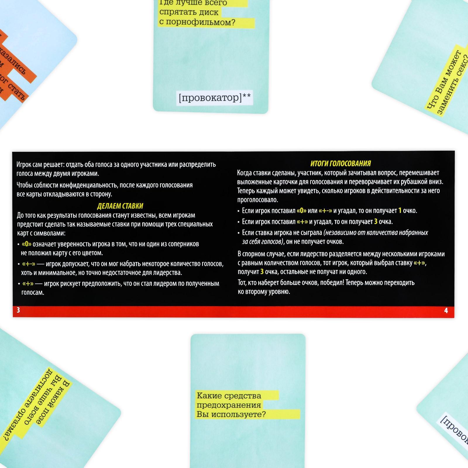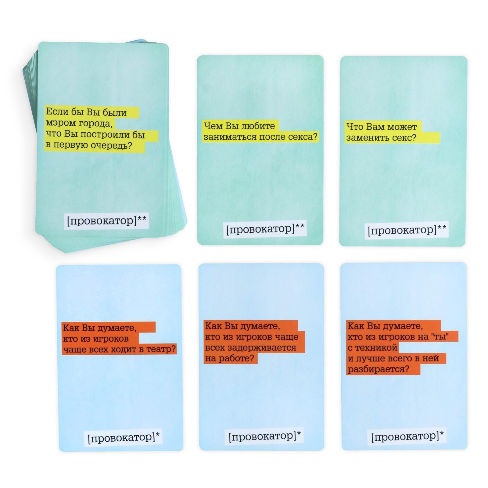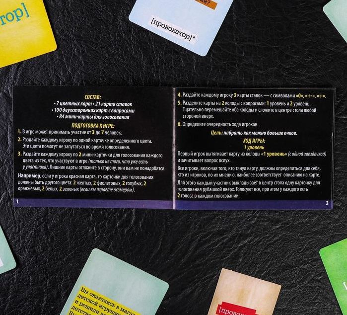 Насколько хорошо вы знаете… Себя, друзей, коллег и то, что они о вас думают! Провокационная игра поможет вам узнать это и да же больше. Интригует, не правда ли…?! А может, я не хочу ничего знать? Ага, уже нахмурились и задумались, а вдруг правда будет не так привлекательна? Не волнуйтесь, в игре нет обидных и ужасных вопросов, которые бы вас задели до глубины души и ко всему в ней 2 раунда, которые можно играть один за другим или вообще использовать как правила к двум разным играм. Интересно, что за раунды? Первый раунд игроки тянут карточку, зачитывают написанное на ней и закрытым голосованием решают, кто наиболее подходит к написанному из присутствующих. Первый раунд позволит узнать о себе много нового и неожиданного! Второй раунд один из игроков ведущий, он зачитывает карточку, а потом пишет ответ на листе бумаги, остальные участники должны то же ответить на этот вопрос но не от себя, а предположить, что написал ведущий. Второй раунд поможет спровоцировать на откровенность других. В комплекте: 7 карточек игроков (разного цвета),140 двусторонних карт с вопросами (280 вопросов), 84 карточки голосования, 21 карточка для ставок (оценки).