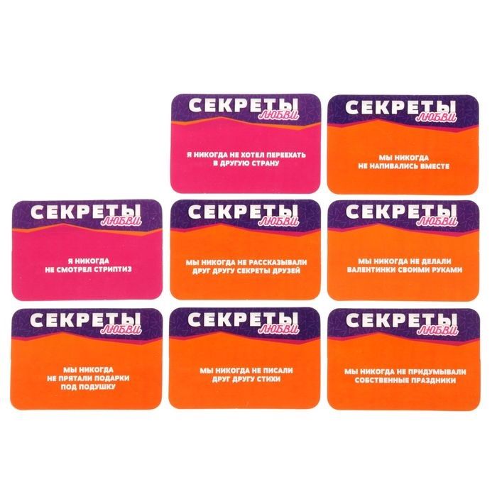 Как вы думаете, чего никогда не делала ваша вторая половинка? Может быть, не писала романтические письма или не знакомилась через интернет? Узнайте любимого человека с совершенно новой стороны. Цель игры — угадать ответы своей половинки и собрать большее число карт. В наборе вы найдёте двусторонние карточки с самыми разными утверждениями. С одной стороны фразы начинаются со слов «Я никогда не…», а с другой — «Мы никогда не…». Если вы веселитесь вдвоём, используйте первую сторону, а если компанией — вторую. В свой ход тяните карточку и зачитывайте то, что на ней написано. Подумайте, правдиво ли утверждение по отношению к любимому человеку. В этот момент ваш партнёр тоже отвечает на вопрос с помощью карт ответа. Если вы угадали, то забираете карту себе. При игре парами одна пытается определить, как ответит на вопрос вторая. Если это получается, то карточку в качестве победного очка забирают отгадывавшие.