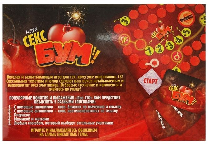 Мы молоды, полны энергии и заряжены позитивом! Поэтому игра под названием «Секс Бум» - точно для нас. Потому что она сочетает в себе элементы азарта, непристойности и юмора! Нам уже есть 18, и мы можем позволить себе зайти чуть дальше, чем просто общение… С кем играть? Играть можно вдвоем, а можно компанией, разделившись на команды. Главное, чтобы в игре участвовали представители обоих полов. Ведь она создана для раскрепощения! Правила довольно просты, и все они подробно прописаны. В набор входит игровое поле с фишками, карточки и песочные часы. Выберите фишки и установите их на старте. Ими вы будете ходить. А победит тот, кто первым придет к финишу. На карточках написаны слова и устойчивые выражения из области секса. Вытянув карточку, один из игроков команды должен объяснить то, что на ней написано другим участникам за ограниченное количество времени, для чего и предусмотрены песочные часы. Команда угадала – двигает фишку вперед, не угадала – остается на месте. Тот, кто объясняет, выбирает один из пяти способов объяснения. В зависимости от сложности способа он может продвинуться на один, два, три, четыре или пять ходов вперед. В игре есть особые поля, попав на которые можно продвинуться вперед или назад, а также объяснить слово тем способом, который там указан. Особое поле «Блиц» таит свой секрет, который вы узнаете, заглянув внутрь коробки… Такая игра добавит пикантности в любую вечеринку и сделает ее незабываемой! Нам уже не терпится начать!