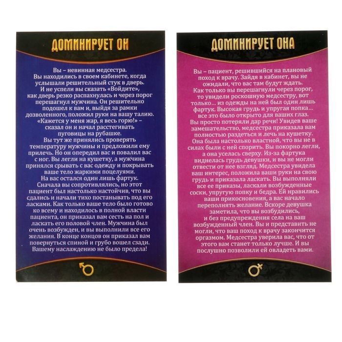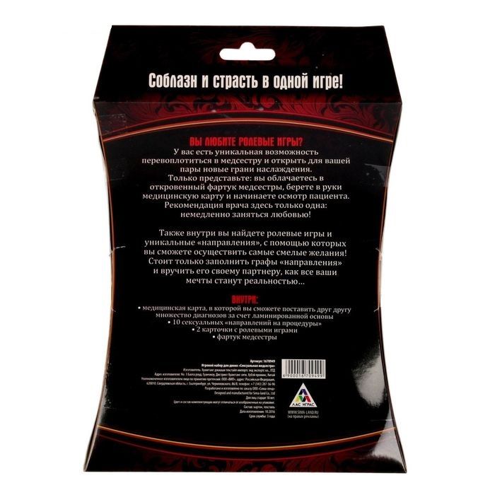 Вы любите ролевые игры? У вас есть уникальная возможность превратиться в сексуальную медсестру и воплотить в жизнь свои самые горячие сексуальные фантазии. Только представьте: вы облачаетесь в откровенный фартук, берёте в руки медицинскую карту и начинаете осмотр пациента. Рекомендация здесь может быть только одна: немедленно заняться любовью! Внутри вы найдёте ролевые игры, в которых сможете почувствовать себя и доминантом, и сабмиссивом. А также уникальные сексуальные «направления» — заполните их, вручите своему партнёру и осуществите свои самые смелые фантазии! В комплекте: медицинская карта, 10 направлений на процедуры, 2 карточки с ролевыми играми, фартук медсестры.