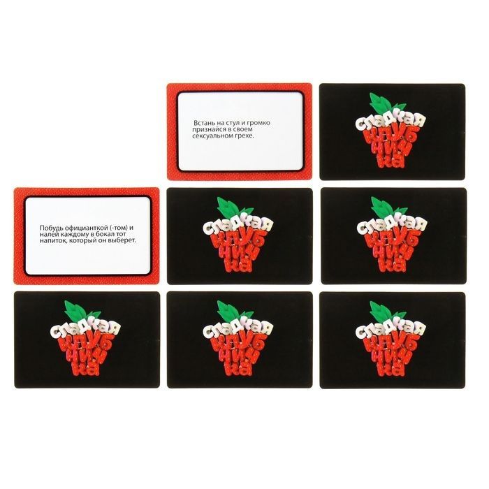Только представьте: обнаженное женское тело, закрытые глаза, ваши друзья … Стоп! Друзья? Да, да, вы ничего не перепутали, мы предлагаем вам устроить горячую вечеринку с клубничкой. Не беспокойтесь, раздеваться не нужно. Все очень просто! Ваша цель – прикрыть клубничкой грудь одной соблазнительной красотки. Для этого прикрепите большое игровое поле с портретом девушки на стену и наденьте маску на глаза. А теперь попробуйте приклеить клубничку на тело искусительницы, прицеливаясь к груди. Вам потребуется только интуиция и ловкость рук, ведь зрение вам уже не помощник! На поле помимо изящных женских форм есть игровые баллы, и ваша задача – набрать больше всех. А тому, кто заработает в одном раунде меньше баллов, чем другие игроки, достанется горячий фант с заданием! Победителем станет самый меткий участник! В комплекте: игровое поле, 10 игровых элементов (клубничек), 15 карточек с фантами, маска для глаз, скотч.