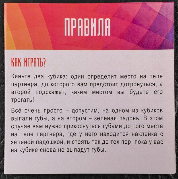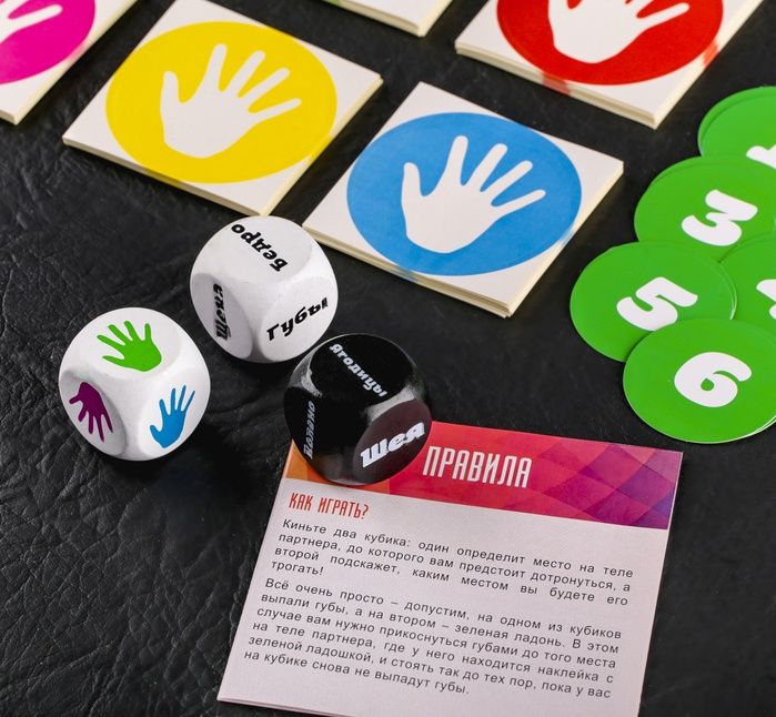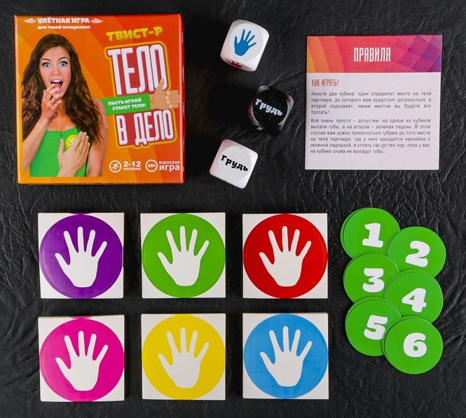 Культовая игра в «Твист-р» по новым правилам! Эта популярная игра знакома многим, но именно этот твист-р очень отличается от классического. Ведь здесь игрой станет ваше тело! Да-да, именно на него будут клеиться наклейки, место которых определят кубики. Уже в предвкушении? И правильно! Ведь вас ждут невероятные позы и фантастические эмоции. Правую руку на грудь партнера! Кидайте кубики, один из которых определит место на теле партнера, до которого вам предстоит дотронуться, а второй подскажет, каким местом вы будете его трогать! Губы, шея, грудь, руки – всё смешалось в этой игре. Яркие наклейки разнообразят процесс, но если они закончатся – в правилах написан вариант игры без их использования. С кем играть? Можно играть парами, а можно и большой компанией! Ведь «Тело в дело» станет настоящей бомбой на вашей вечеринке. Игра поможет вам поближе познакомиться друг с другом, немного расслабиться и отлично повеселиться. Собирайте компанию друзей и проводите время незабываемо! В комплекте: 3 кубика, листы с наклейками, 12 карт жеребьевки, правила.