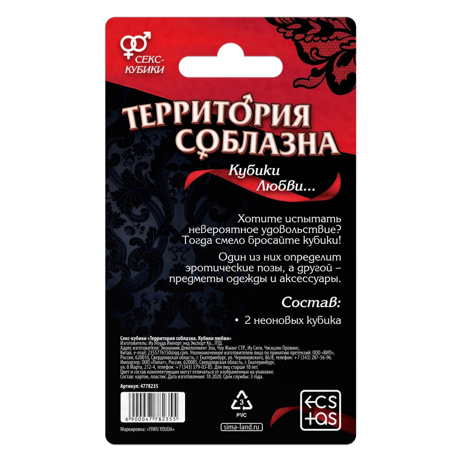 Осторожно! Вы вступили на территорию соблазна Хотите испытать невероятное удовольствие? Тогда смело бросайте кубики! Один из них определит эротическую позу, а другой — предмет одежды или аксессуар, который должен быть на одном из вас.