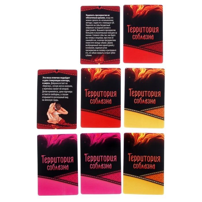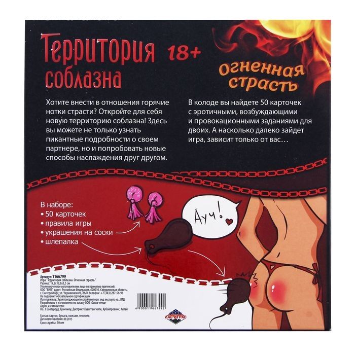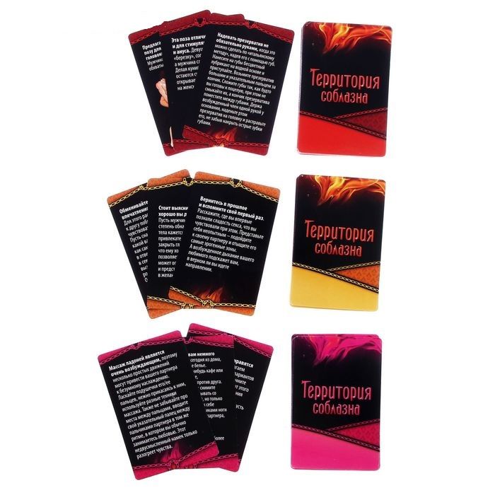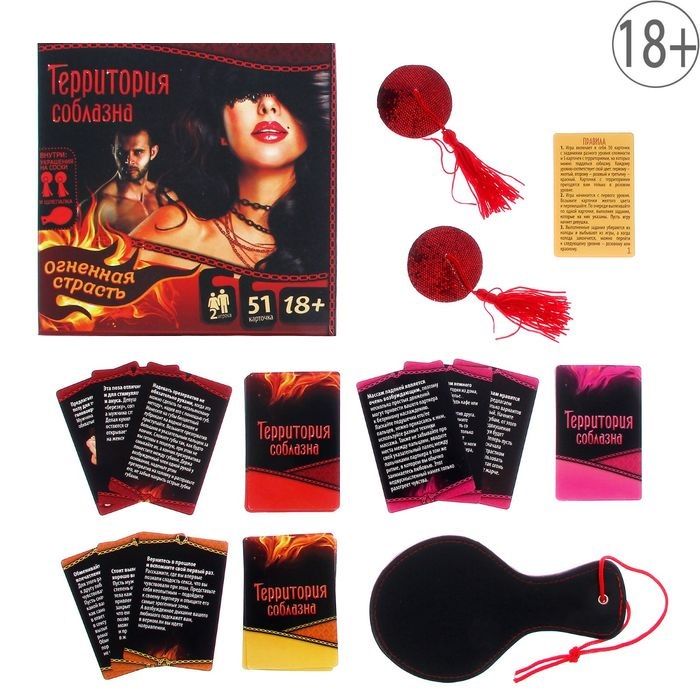 Постарайтесь не обжечься, ведь в «Территории соблазна» горит огонь страсти. И это не просто слова. Откройте набор и убедитесь в этом. Попробуйте ранее неизвестные способы наслаждения друг другом. Забудьте о запретах! Этой ночью можно всё… Игра включает в себя 50 карточек с заданиями разного уровня сложности и 5 карточек с территориями, на которых можно поддаться соблазну. Где Вас настигнет волна страсти сегодня? В кинотеатре или парке? С каждой колодой задания становятся горячее. Откровенные фантазии, позы, позволяющие получить максимум наслаждения от близости, нежные прикосновения и возбуждающие ласки — все это ждёт Вас в этой игре. Воспользуйтесь аксессуарами, которые входят в набор. В комплекте: 50 карточек, правила, украшения на соски, шлёпалка.