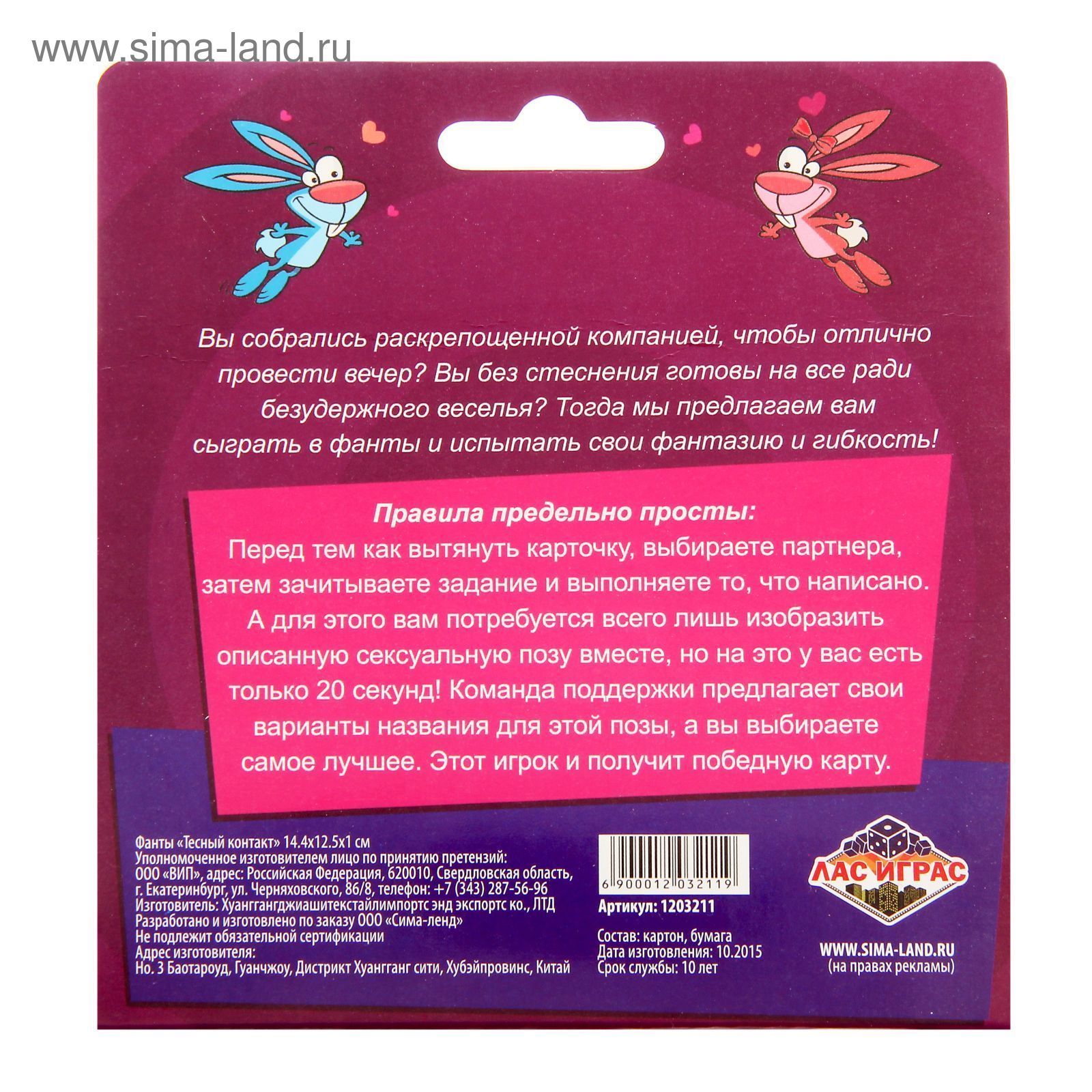 Испытайте фантазию на деле! Сегодня для этого у вас есть всё! Уже собрались большой компанией друзей, чтобы отлично провести вечер? Не забудьте взять на вечеринку фанты «Тесный контакт»: в них вы найдёте массу пикантных и активных заданий, которые возбудят воображение и подарят веселье. Победит самый находчивый! В фантах предстоит изображать с помощью мимики и жестов различные сексуальные позы. Вот только названия у них очень необычные и смешные! Как вам, к примеру: разъярённый воин расщепляет бамбук? Перед тем, как вытянуть карточку, выберите партнера, а затем вместе прочитайте название позиции. У вас есть 20 секунд, чтобы принять эту позу, а остальные участники пусть догадаются, что вы имели в виду. Тот, кто предложит самое оригинальное название, получает карточку. А победит тот, кто наберёт больше всех фантов.