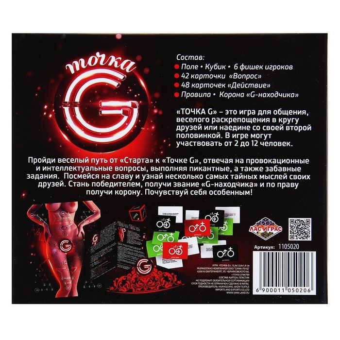 Хотите побороться за право носить корону «G-находчика»? Тогда вперёд! С новой игрой для больших компаний «Точка G» вам не придётся скучать. В игре каждому предстоит пройти от старта к общему финишу — точке G! Кидайте кубик, он подскажет, как передвигаться по полю. А по пути вам предстоит отвечать на откровенные вопросы и выполнять пикантные задания! Все задания и вопросы поделены на 3 уровня сложности и отличаются цветами. Зелёный — легко, красный — средне, чёрный — сложно. Если ваша фишка встала на клетку с зелёной буквой «В» — тяните зелёную карту с простым вопросом. Вам предстоит рассказать друзьям обо всех сексуальных партнёрах, пофантазировать вслух и подарить самые жаркие поцелуи! Тот, кто дойдет до точки G первым, объявляется «G-находчиком» и носит корону со этим званием весь вечер! В комплекте: корона победителя правила игры 6 фишек игроков 42 карточки вопросов 48 карточек заданий игровое поле кубик.
