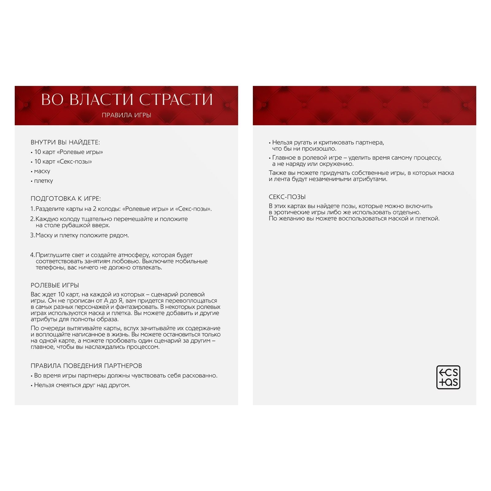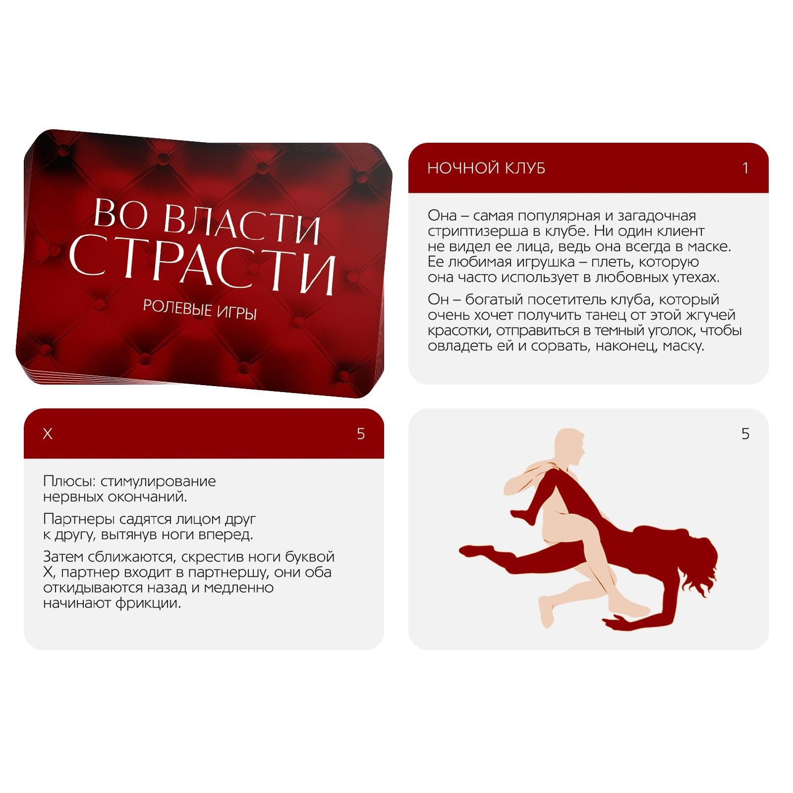 Страсть полностью овладеет вами и унесёт в пучину соблазна и наслаждений. Как? С помощью пикантных ролевых игр и ещё более пикантных эротических поз. Перевоплощайтесь в невероятные образы и наслаждайтесь друг другом! Окунитесь в мир наслаждений! Вас ждёт 10 карточек со сценариями игр. Они не прописаны от А до Я, вам нужно будет пофантазировать. В некоторых ролевых играх используются плётка и маска. Вы можете добавить и другие атрибуты для полноты образа. Также мы подготовили для вас карточки «Позы». По очереди вытягивайте их, зачитывайте описание и смотрите на картинку. Вот и всё, осталось только воплотить её в жизнь! В комплекте: 20 карт, маска, плётка, правила игры.