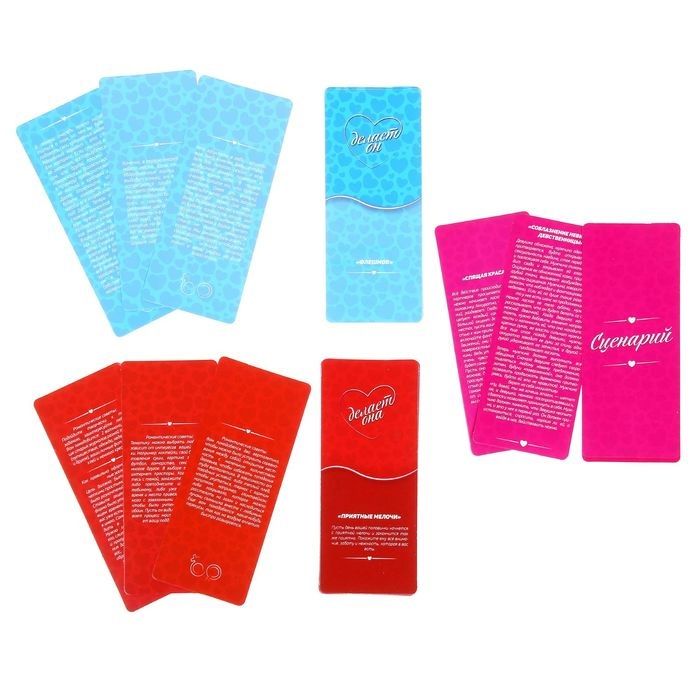 Погрузитесь в атмосферу романтики и нежности… Ведите свой счёт успешных сюрпризов, даря своему любимому человеку незабываемые эмоции. Мы предлагаем вам расширить границы любви и напомнить друг другу о теплоте чувств.В этой игре нет проигравших и победителей, но есть много заботы, ласки и внимания. В наборе вы найдёте 30 карточек, 15 из них предназначены для неё, а другие 15 — для него. Задания, подобранные для каждой половинки, сотканы из самых нежных чувств. Воплощая в реальность эти несложные замыслы, вы наполните ваши отношения яркими эмоциями и любовью. Очень важно не подглядывать в карточки друг друга, так сюрпризы получатся ещё более неожиданными и приятными! Для исполнения некоторых заданий вам понадобятся маски для глаз, они приложены к набору, а бонусом будут являться сценарии ролевых игр! В комплекте: 30 карт, 4 сценария, правила, 2 маски для глаз.