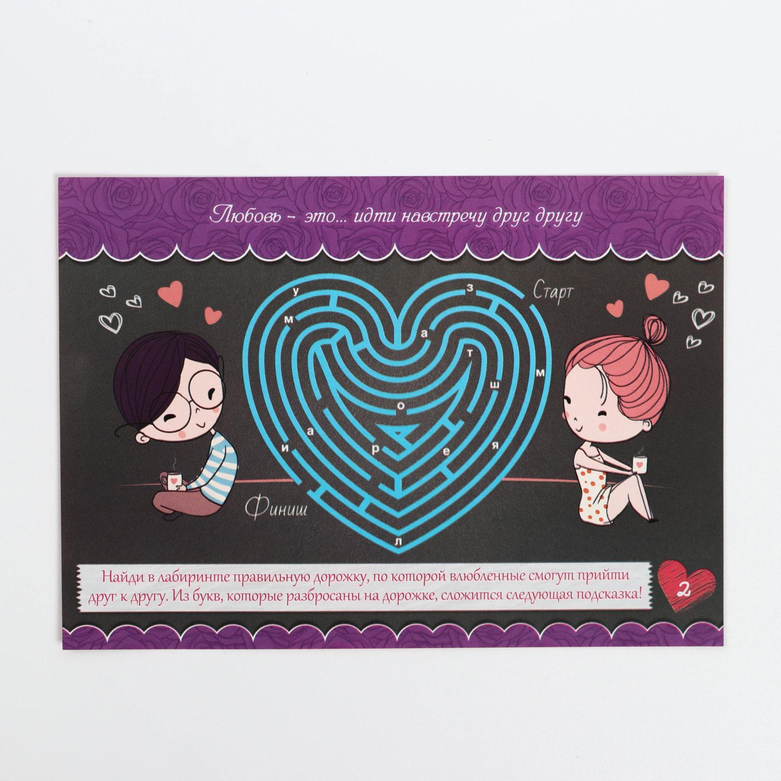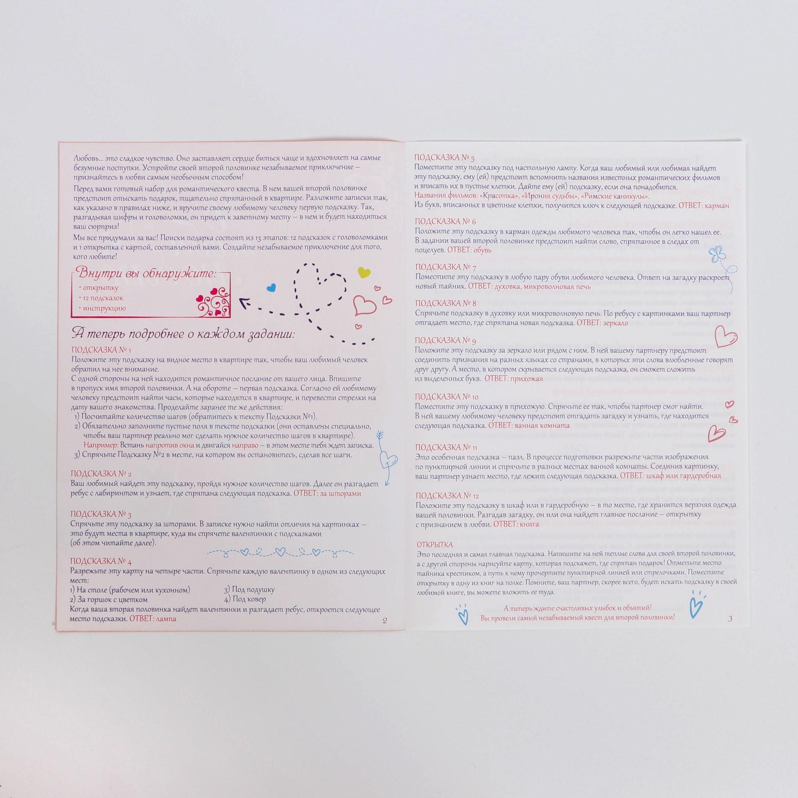 Подарок наполненный нежностью, вниманием и интригой! Удивите свою половинку. Только представьте: вы вручаете любимому человеку письмо, а там… большой секрет. Оказывается, чтобы найти сюрприз, ему нужно идти по следу из подсказок. Верно разгадав шифр, ваша вторая половинка обнаружит сюрприз, который вы спрячете в таинственном месте. В комплекте: 3 сценария романтического вечера, открытка, пошаговая инструкция, 12 готовых подсказок.